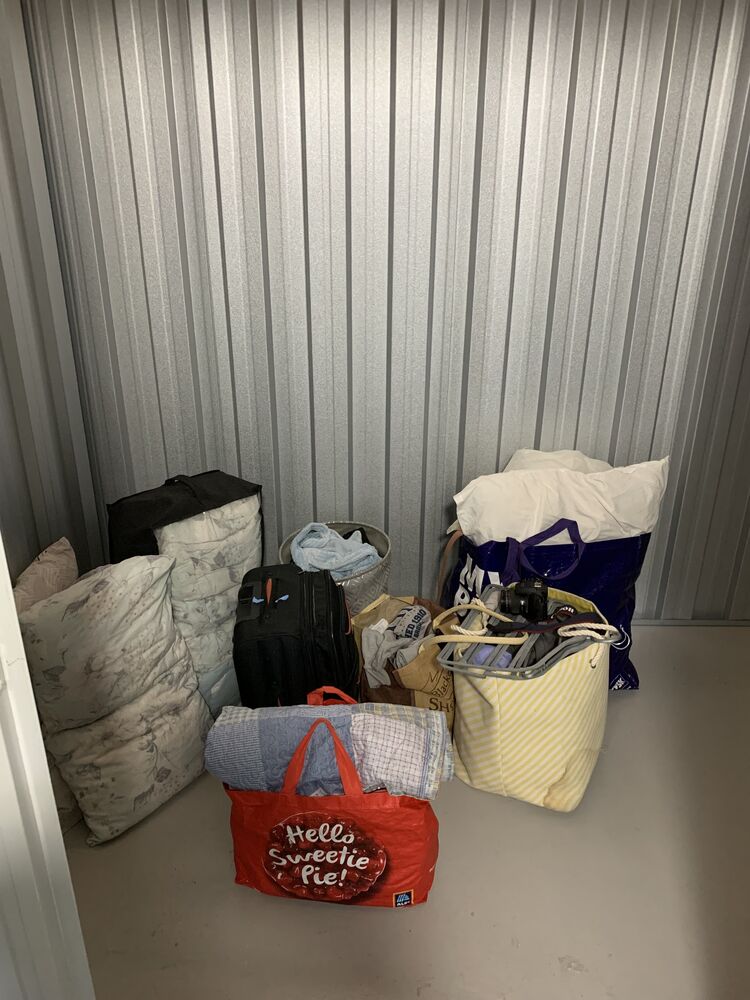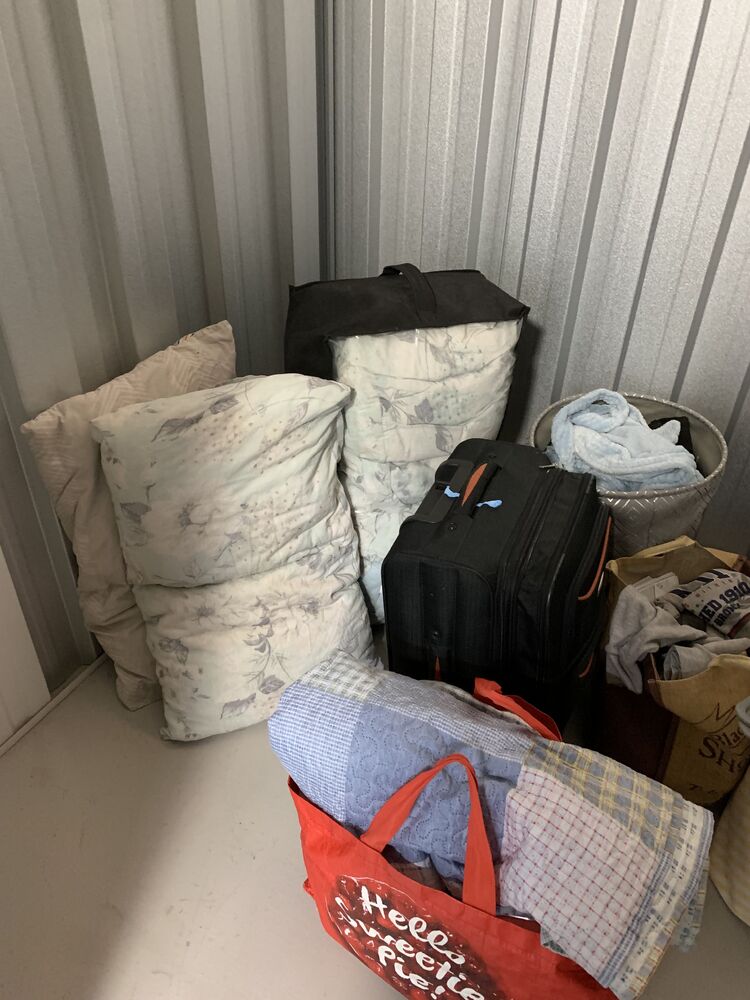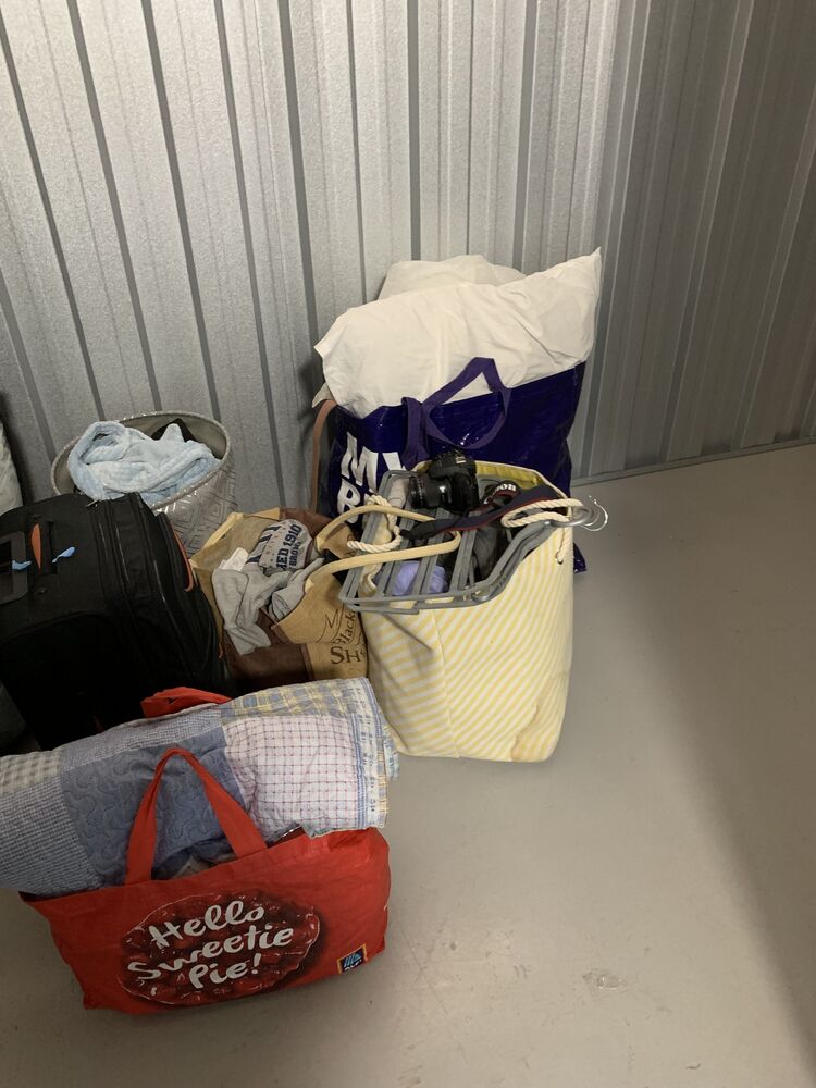 The unit contains three bags of clothing, kitchen and household items, including modern camera. Two baskets of clothing and one bag of bedding and pillows. One suitcase of clothing.