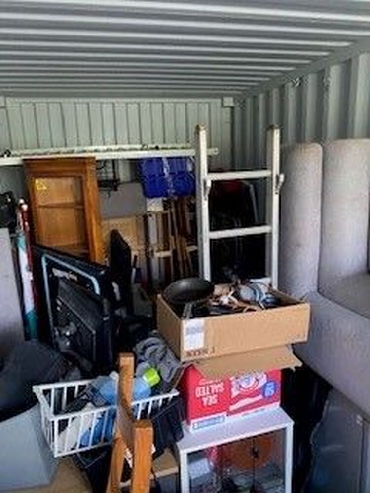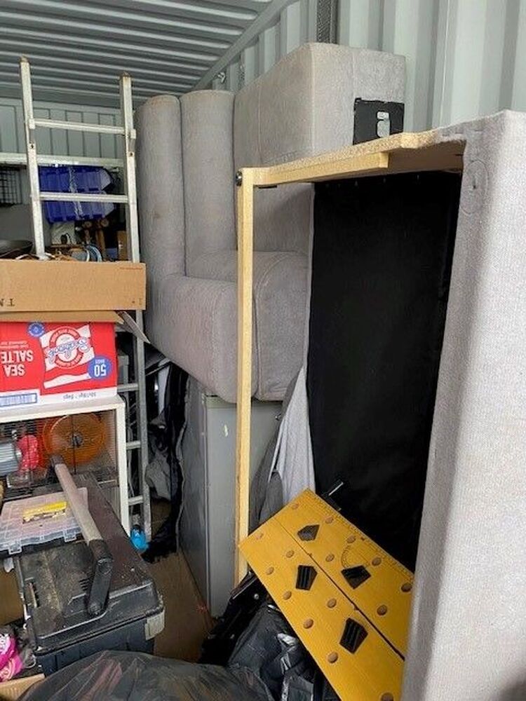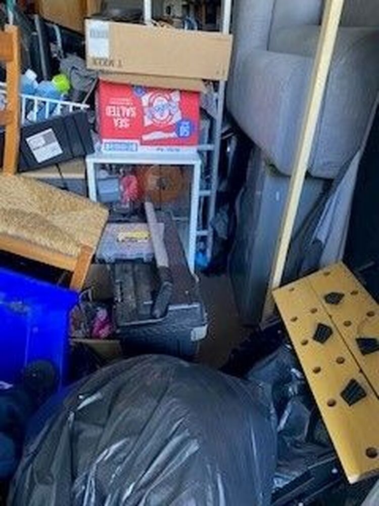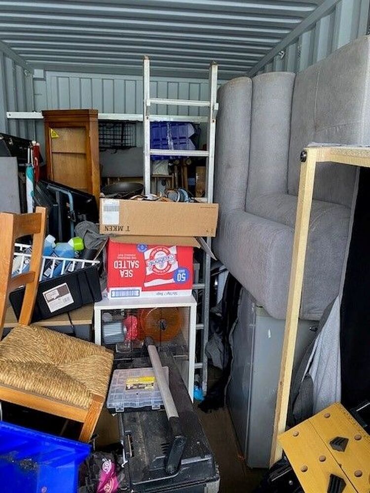 The unit appears to include household items including furniture, fridge, sofa, ladders, workmate, tool-box, kitchen items and an Ion speaker.