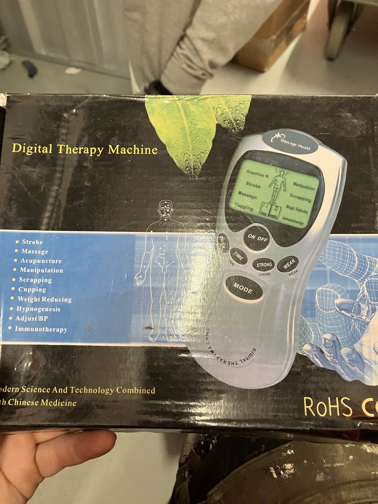 1 x Box containing 24 x nasal aspirators, 16 x PS5 chargers, 1 x digital therapy machine, 1 x “Boots” leather business card holder, 2 x stereo earphones, 1 x head massager, 1 x sunglasses, 1 x picture of ducks, 1 x picture of turkeys, 1 x stamp book, 1 x suction cup grab bar, 1 x Selfie light 1 x “i-Pad” case, 1 x “Samsung” Galaxy S9 screen protector, 1 x tie and 1 x face shield.