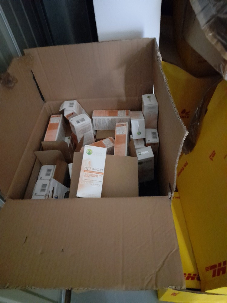 boxes of Palmers Coconut oil formula leave in conditioner, various Garnier cosmetic and beauty items. other boxes of unknown content