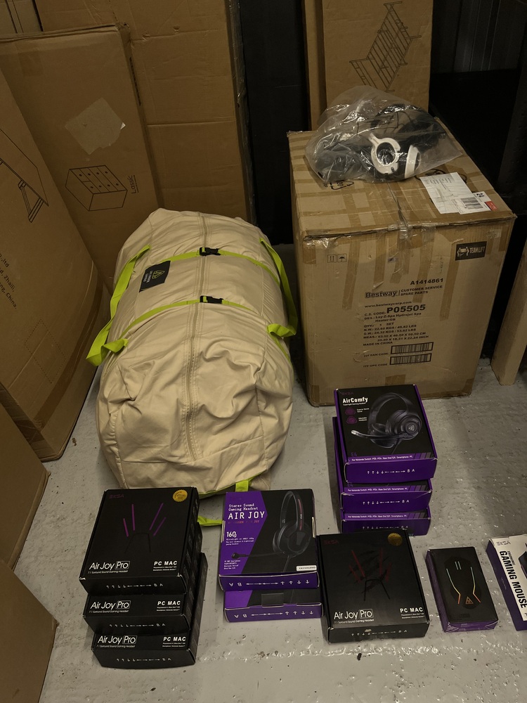 This unit appears to have exercise bike/s, other boxes which appear to have some form of heaters, There are boxes depicting headphones, possibly for gaming, a Henry hoover, a bed frame, electric clothes dryer, PC mice and some other items as per photos.