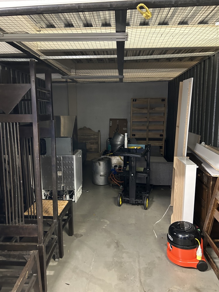 In this 250sqft unit at Alperton we have, furniture, wooden chairs, baby high chairs, wooden stools, vacuum cleaner, workout bench, Commercial cooker, fridge/ freezer, hood, cleaning trolley, 2 sofas, wooden bed frame.