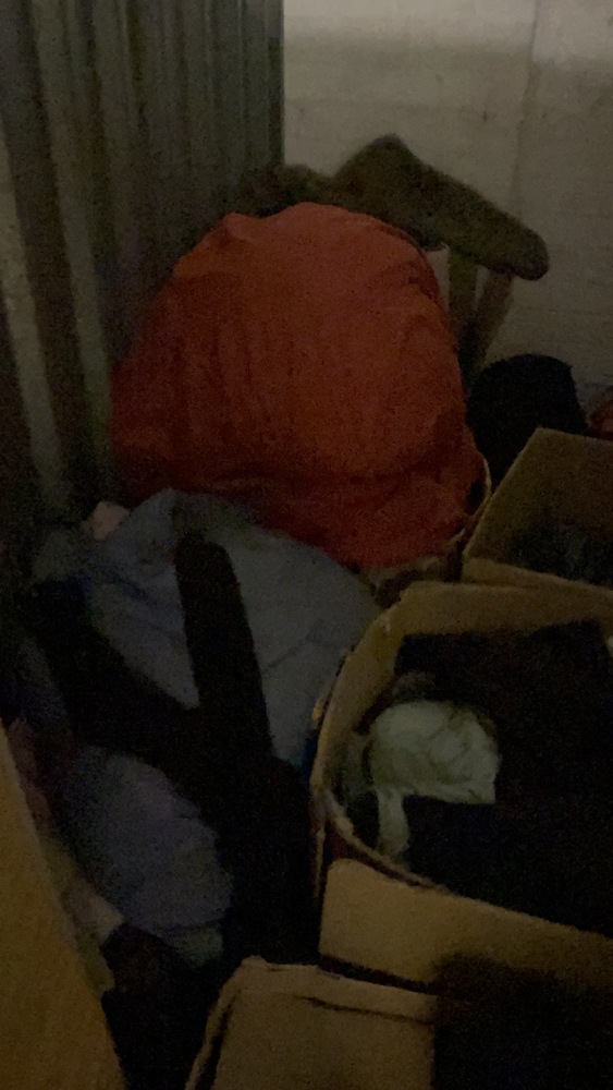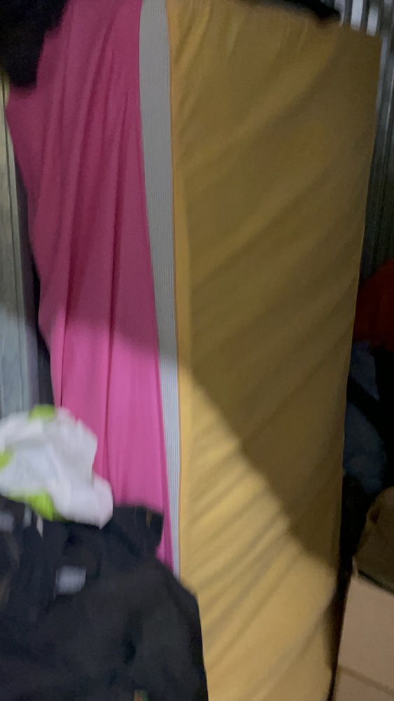 Does 50 square-foot unit have one single mattress, a small tall, white cabinet, personal items, clothes, shoes, and a jacket