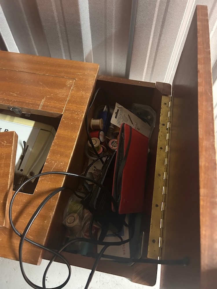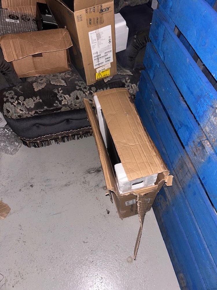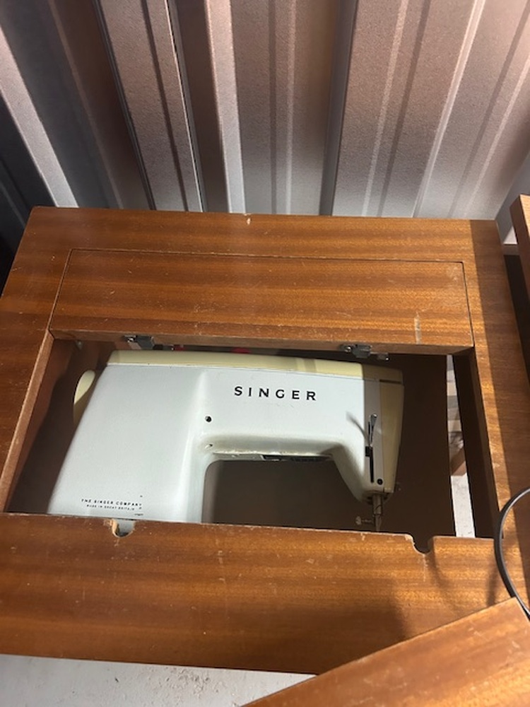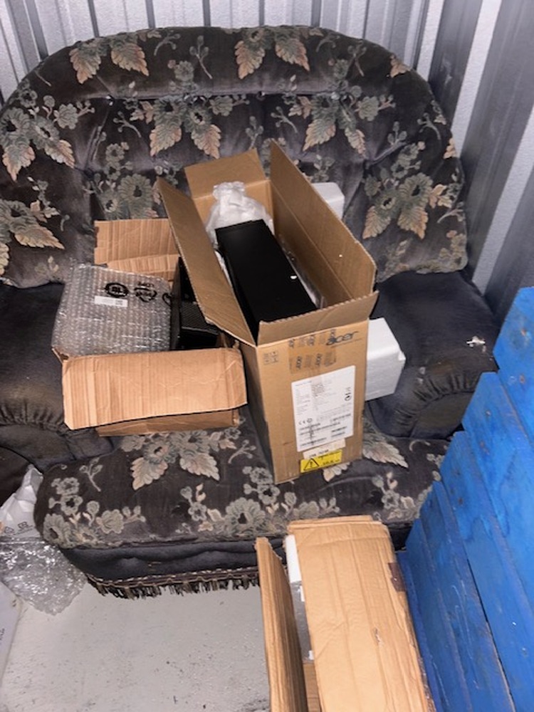 Few items in this unit - double bed, 3 seater sofa, single chair, sowing machine and table plus from what we can tell looks like a computer till system with scanner towers and so on