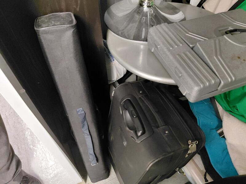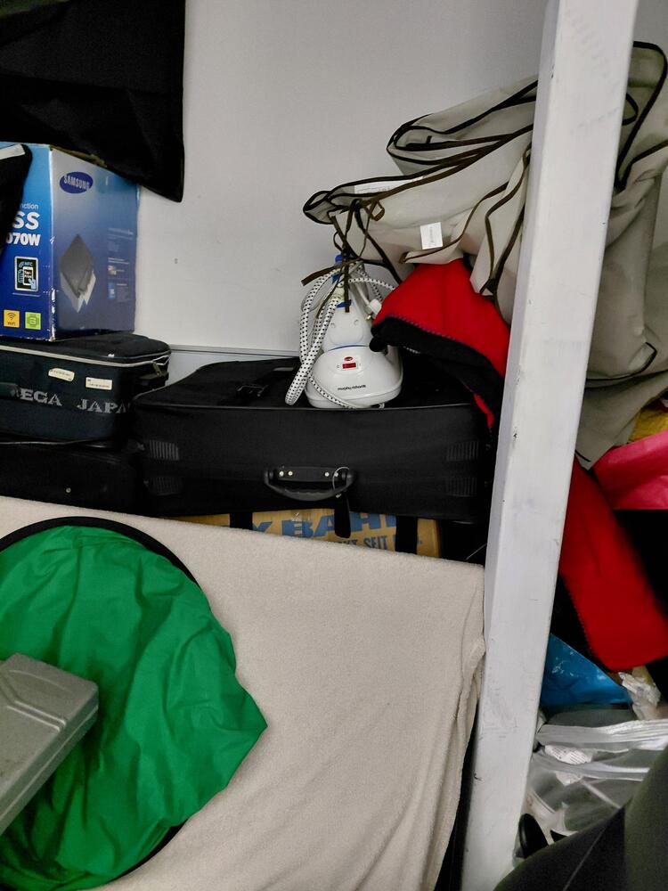 various items including various suitacases, samsung printer box, small table, morphy richards travelling iron, bookshelves and books etc