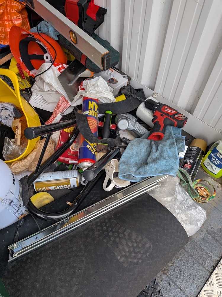 Drill, spirit level, tools, hard hat, bucket, tools, various miscellaneous items, car parts, sprays