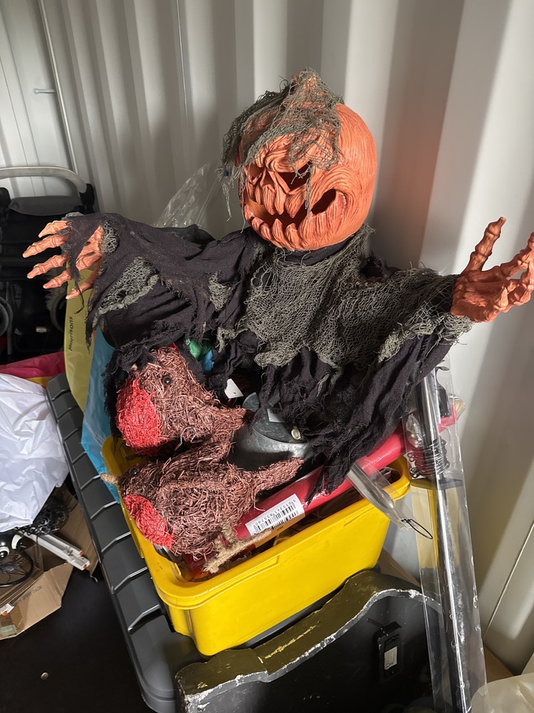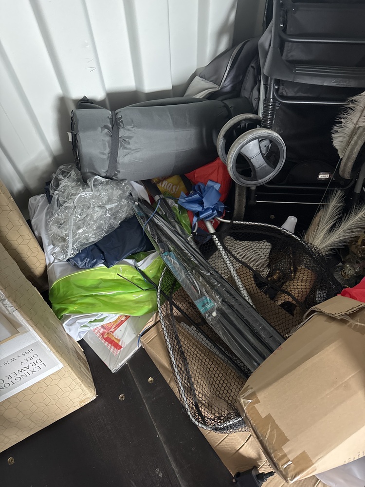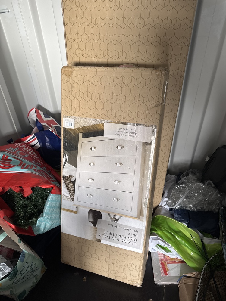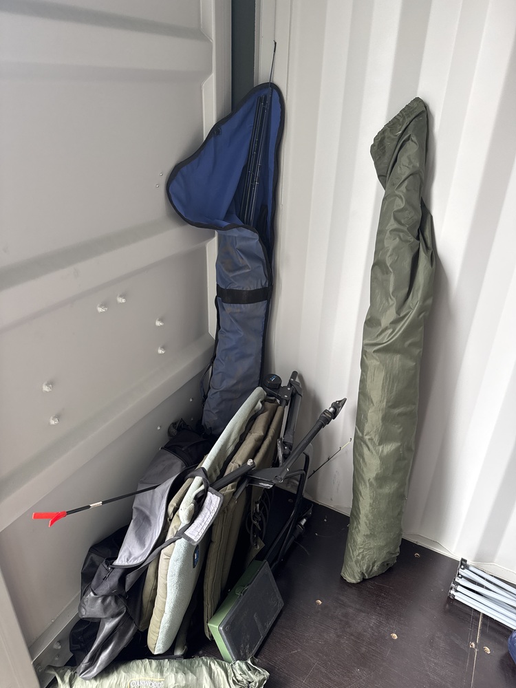 Selling the full contents of a storage container packed with a variety of useful and seasonal items. Includes a great selection of fishing rods and equipment—perfect for beginners or experienced anglers. Also features a large assortment of Christmas and Halloween decorations to cover your festive and spooky needs year-round. A sturdy chest of drawers is also included, ideal for home storage or furnishing.