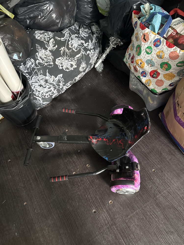 Auctioning the contents of a storage container filled with a variety of items, perfect for resale or personal use. Featured highlights include a gaming chair in good condition, offering comfort for long gaming or office sessions, and a Segway with a seat attachment, ideal for fun or practical transportation. Additionally, there are multiple bags and boxes containing assorted items, offering potential for treasure hunting or resale.