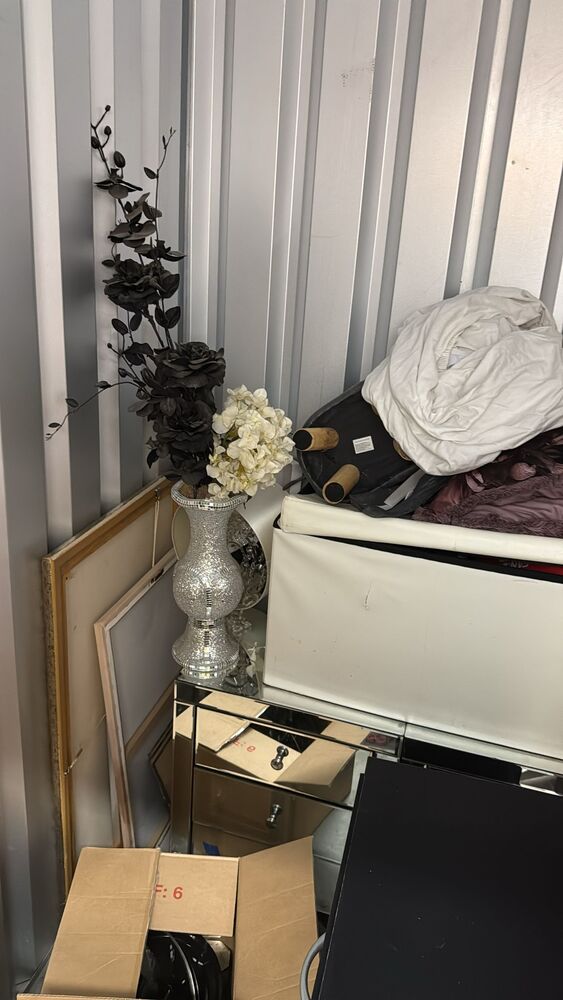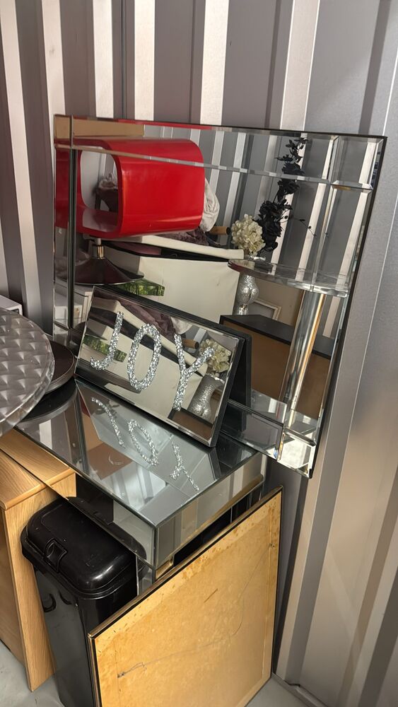 This internal unit has a variety of household items, including a large decorative mirror, a set of mirrored drawers, plus a select of boxes, pictures, a vase and other items