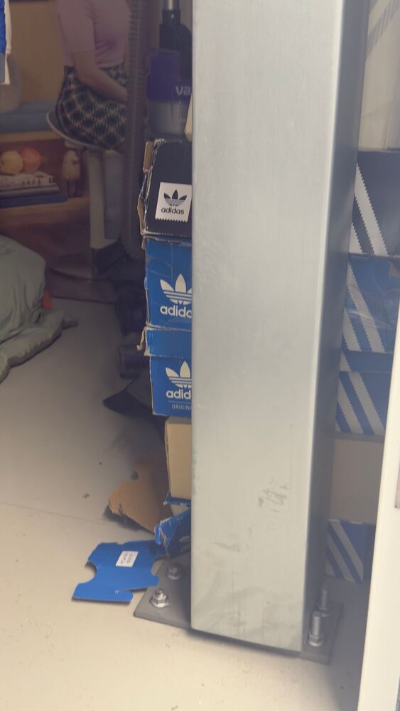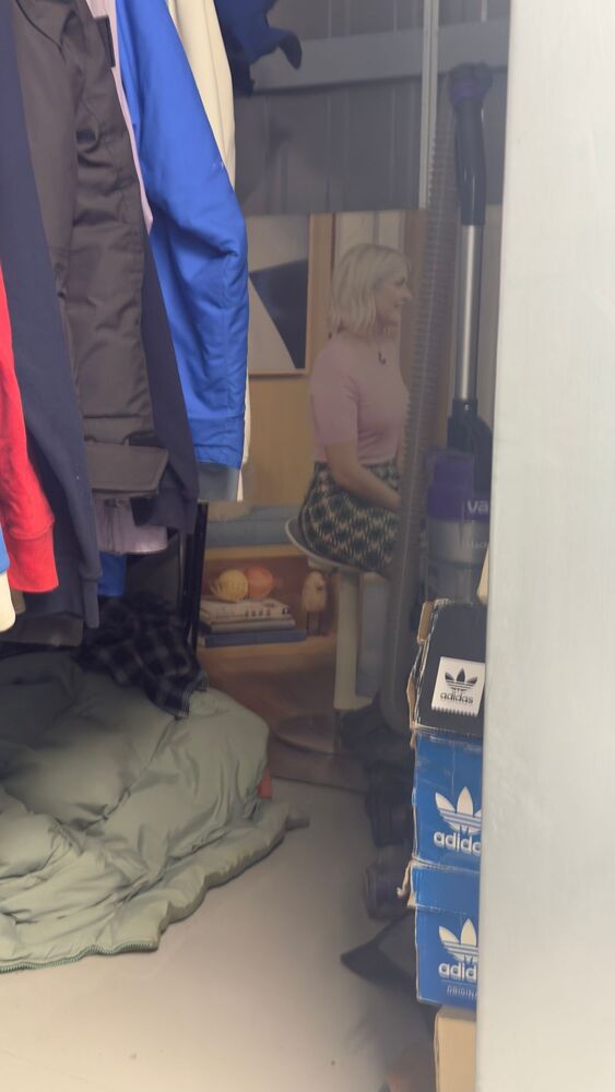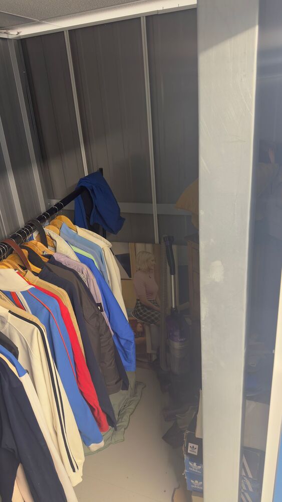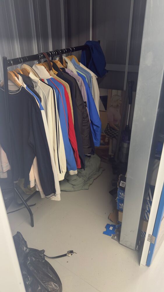 lots of clothes on rail, couple of shoe boxes, bags, vacuum, left as the customer left them, untouched