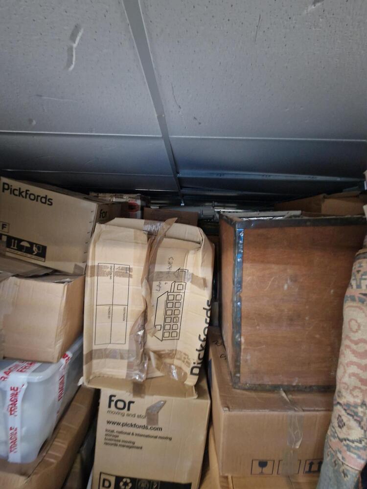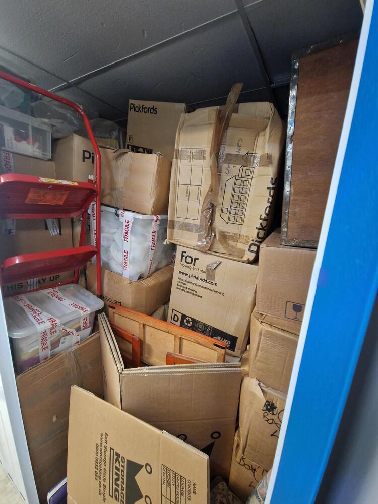 the unit is filled with serveral cardboard boxes and see through boxes, there is also an old carpet and step ladder.