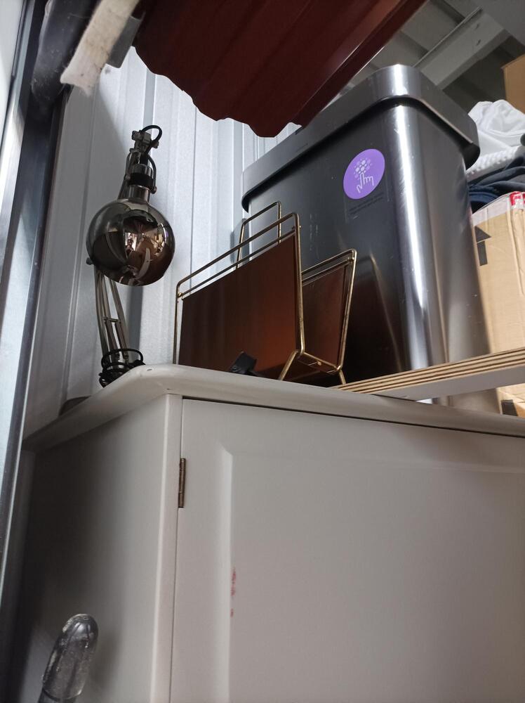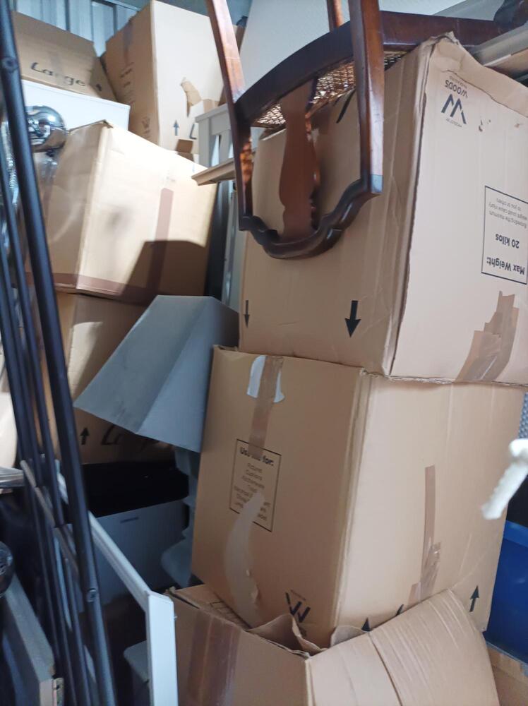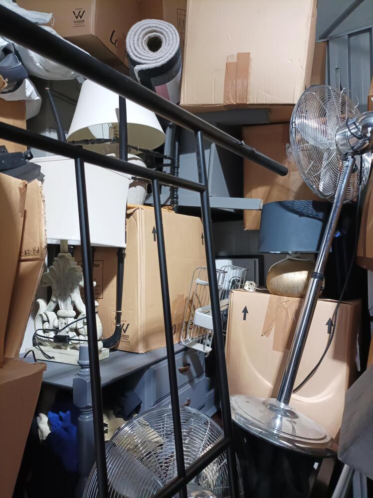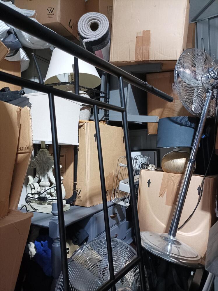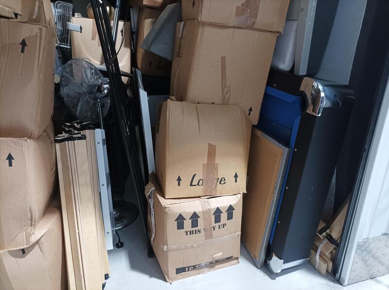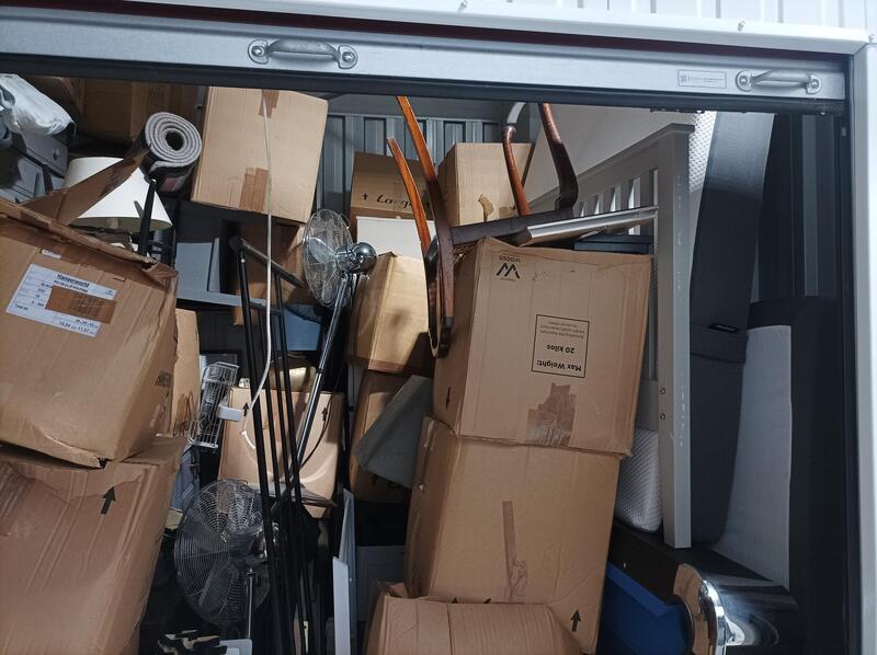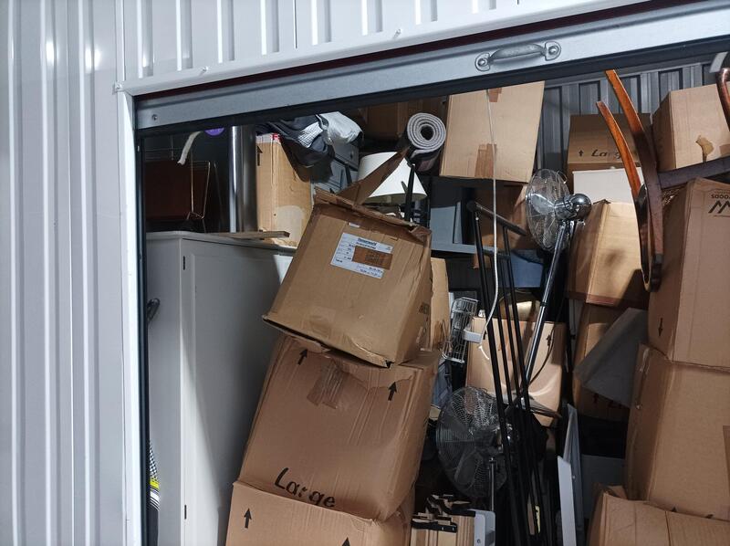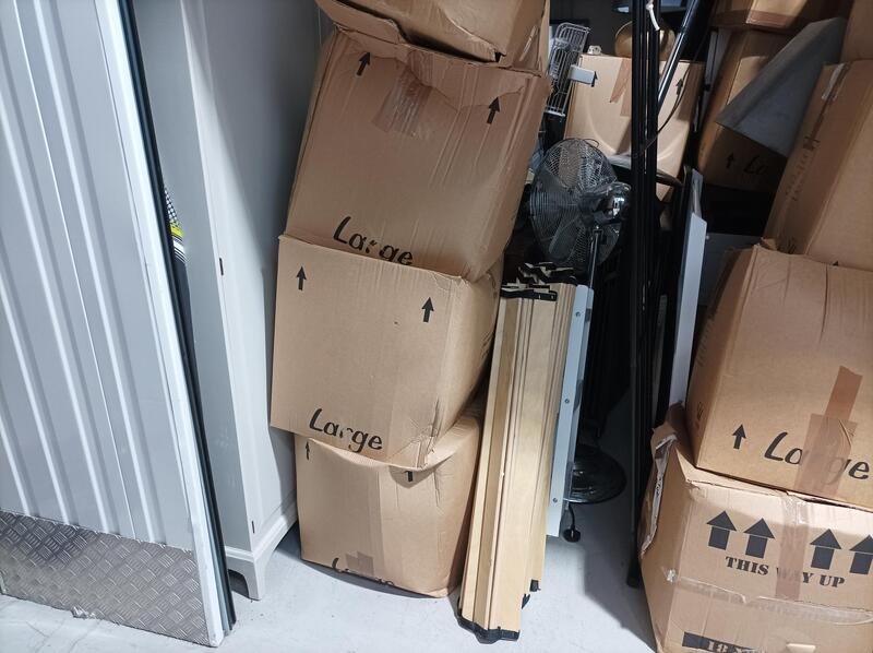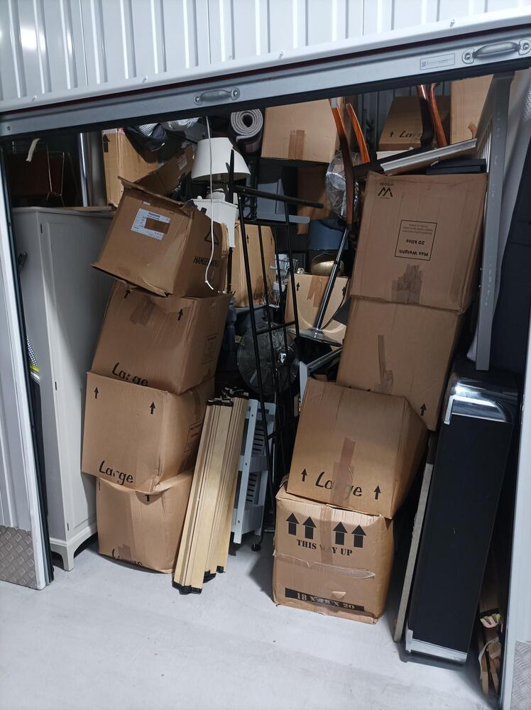 Unit is 9.5 X 9.5 but also around 12ft tall and appears to contain lots of boxes of personal effects, Bedroom Furniture, white goods, Lamps, Rugs, Matrasses, Art work, Home Accessories, three tall fans and a pool table.