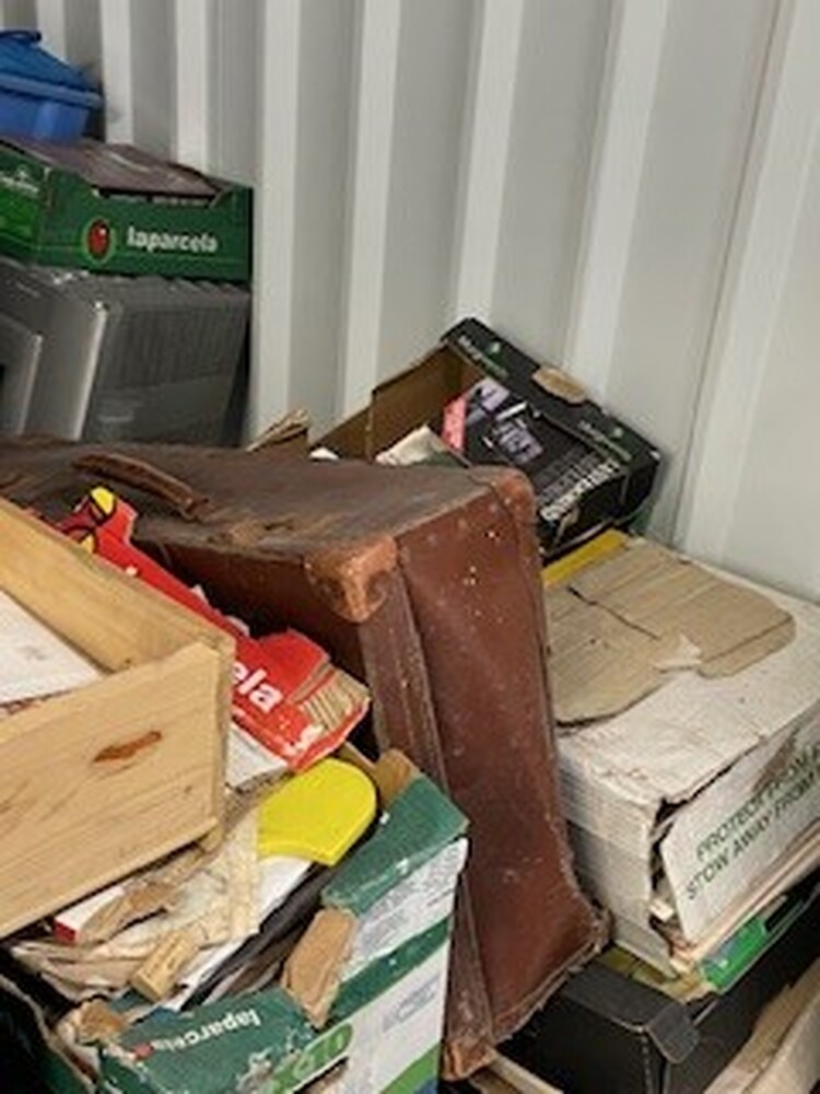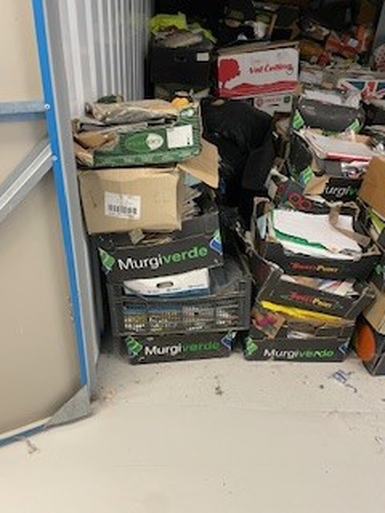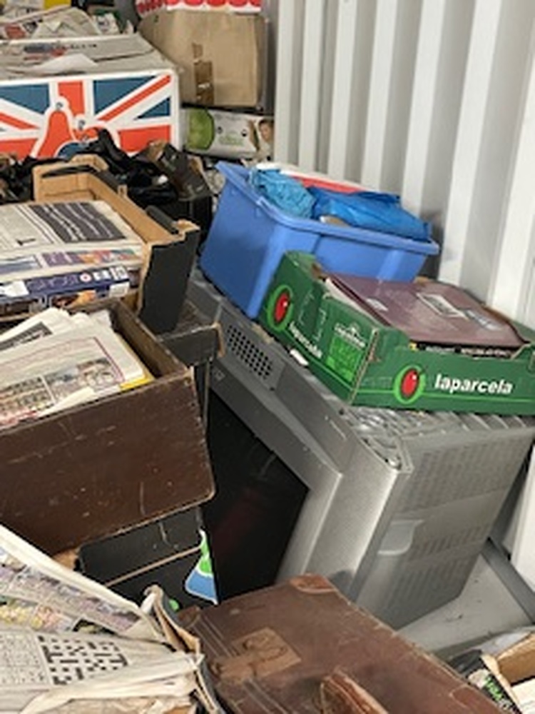 Unit size is 6.5 x 14.5 and appears to contain 100+ boxes & crates of books and unknow miscellaneous items, 20+ bags of clothing, 2-3 TV's