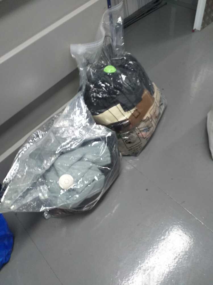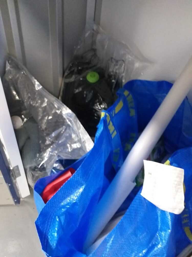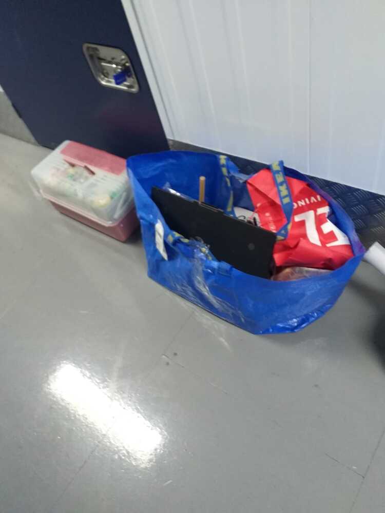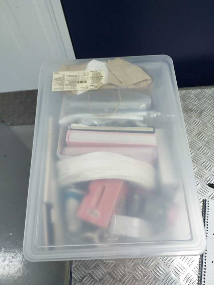 1 x clothes rack, 1 x box of art/craft equipment, 1 x case of household goods, 2 x bags of clothes, 1 x case of art/craft equipment, 1 x bag of art/craft equipment, and a bag of household goods.