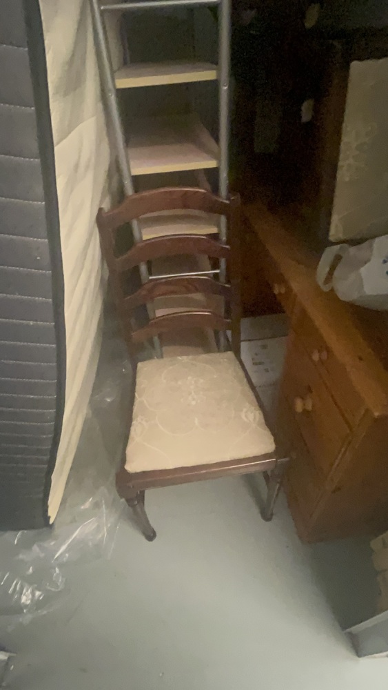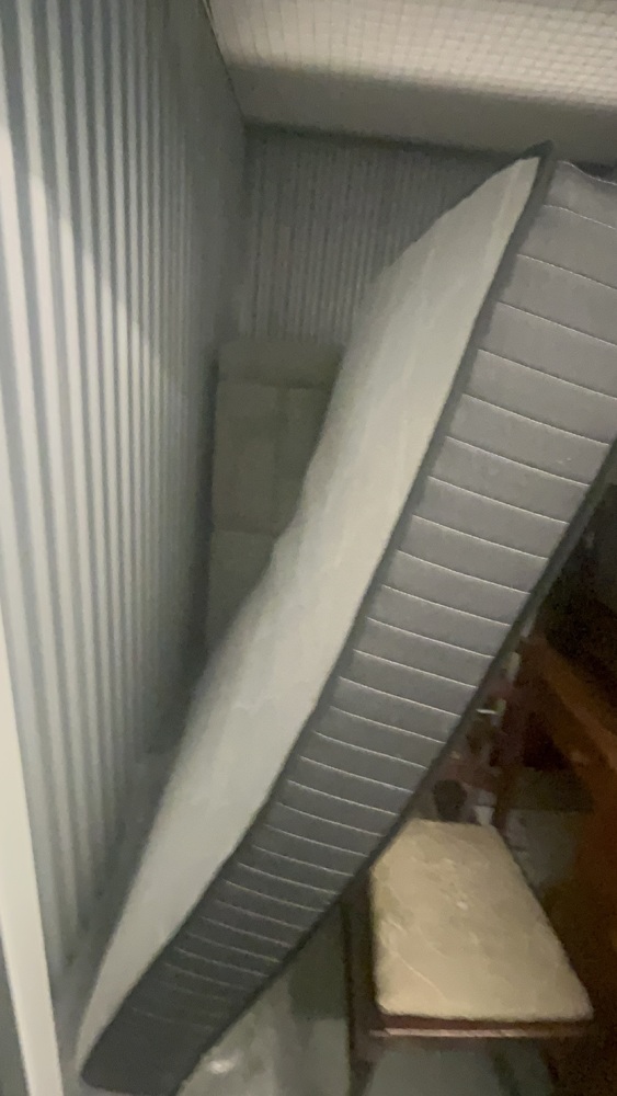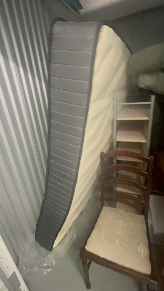 Double mattress and frame. 2 seater cushion sofa. Chairs. Shelving unit, sharp microwave in a box. Domestic