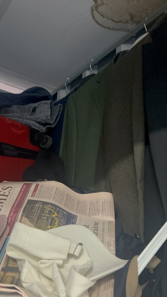 Personal effects and items. clothes, suitcases, jackets, a number of suits as per photos, hung on the wall.