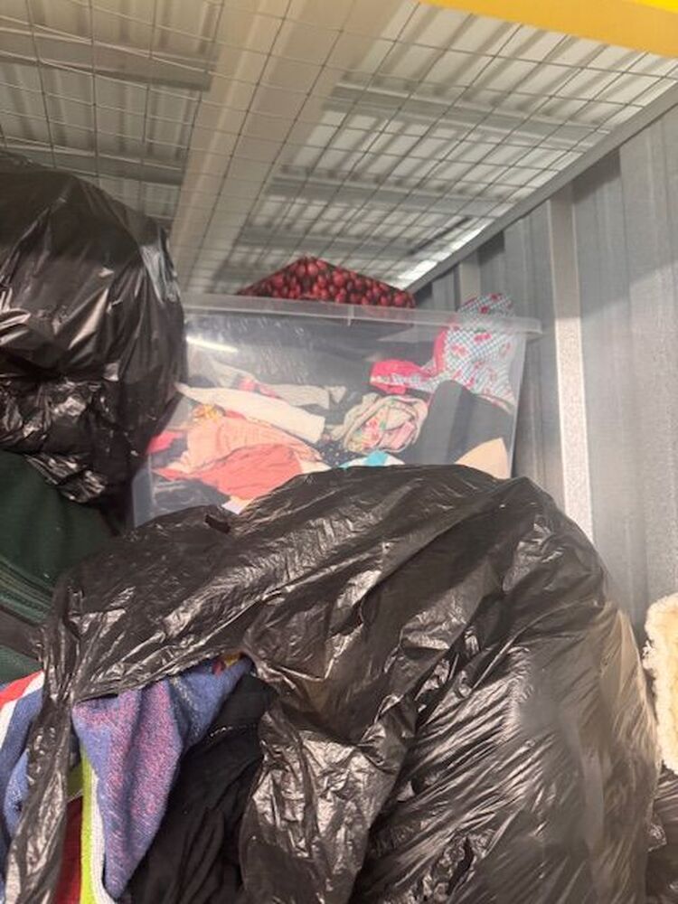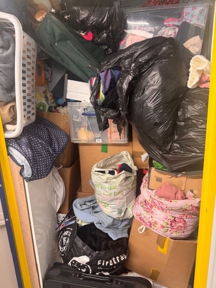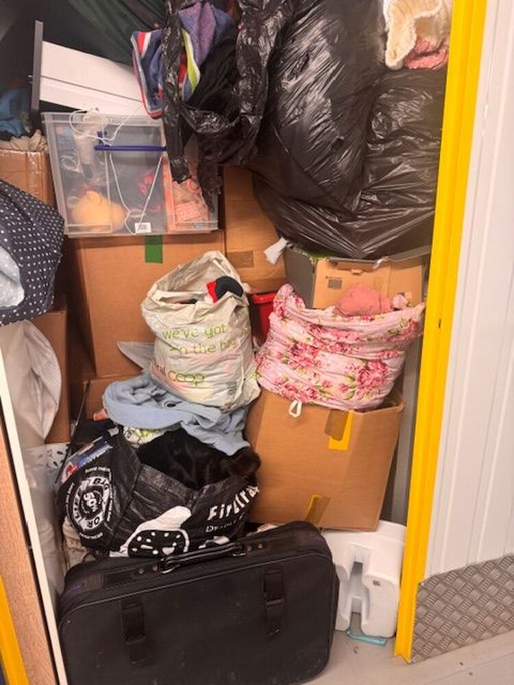 Several carboard/plastic boxes and bags containing various household items and clothes. Unit is fully packed with these items.