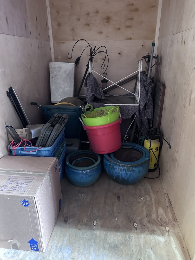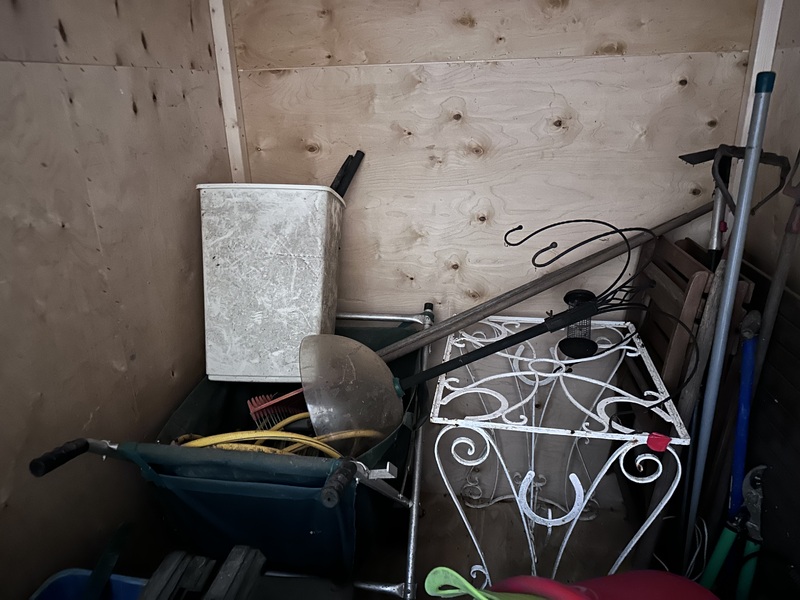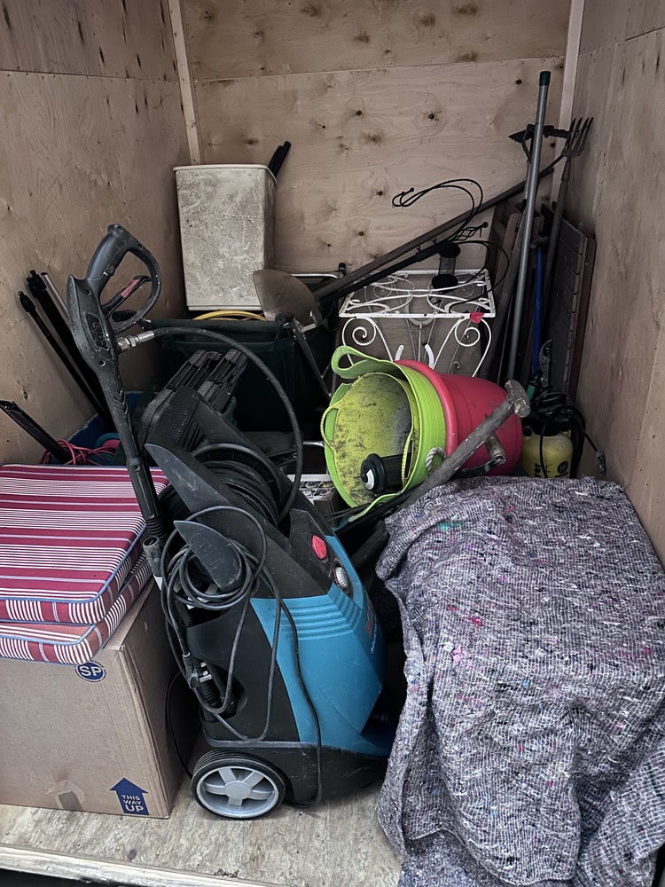 Unit contains miscellaneous garden furniture / tools (including chain saw / pressure washer) and pots