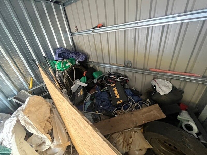 Drive Up 160sqft unit containing various tools, toolkits, spare parts, what looks like go-kart wheels, roofing equipment, and other miscellaneous bits.