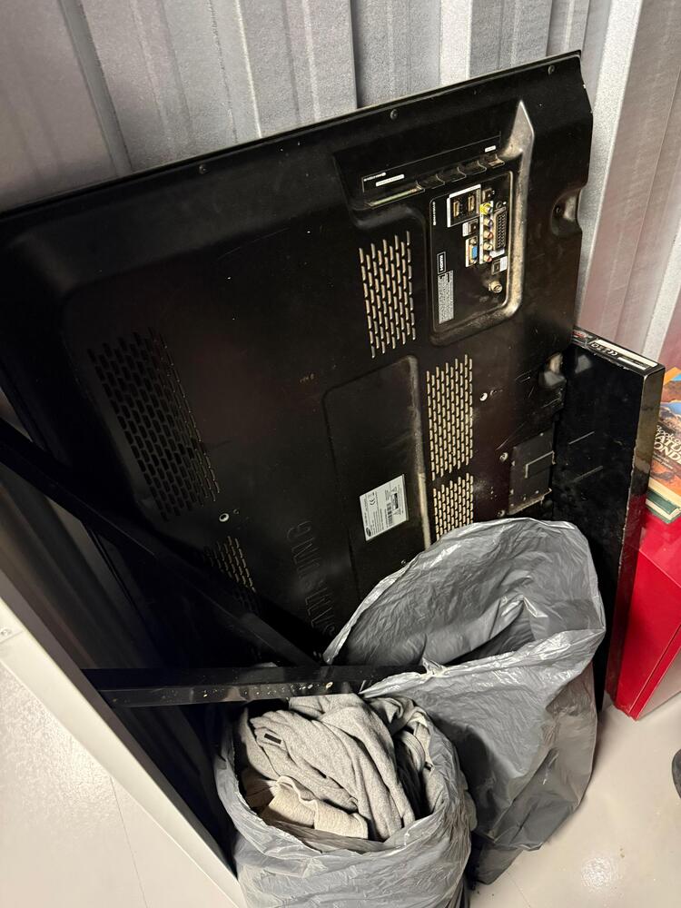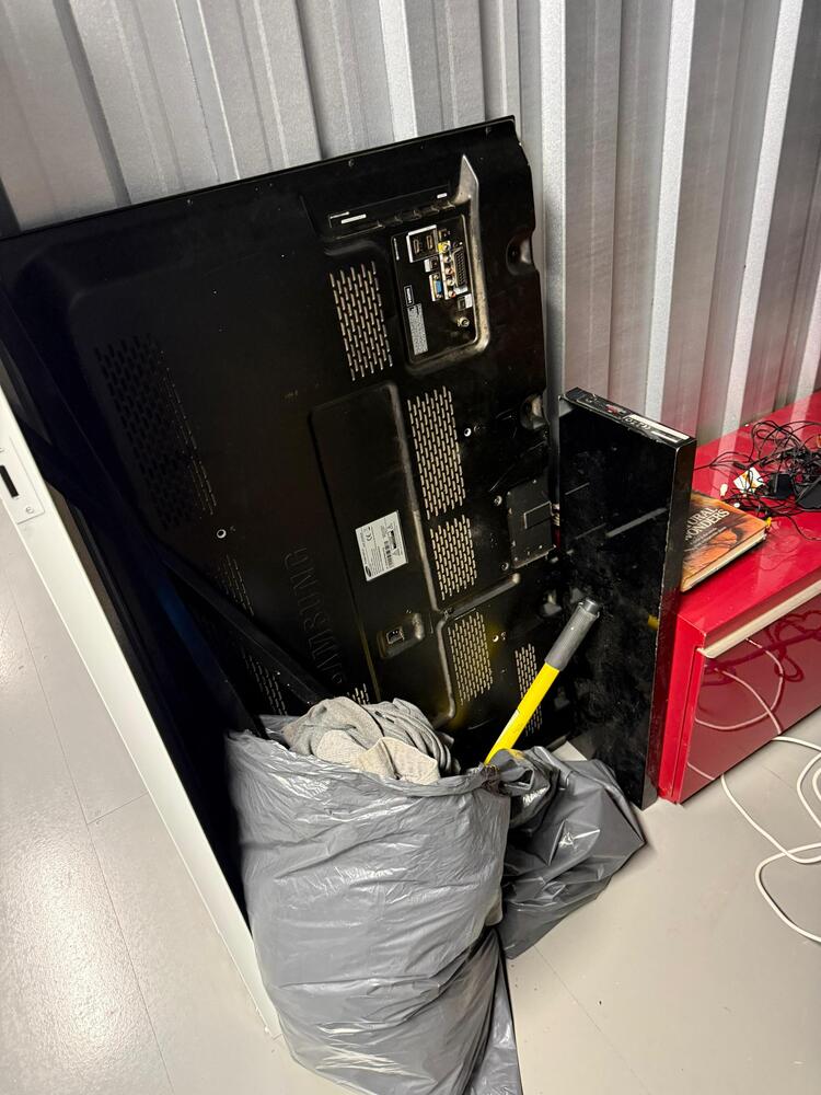 Workmans Tools and tool box , clothes, Versace jacket, wardrobe, chairs, tv, and TV stand low cupboard, hard hat, various cables and other miscellaneous items