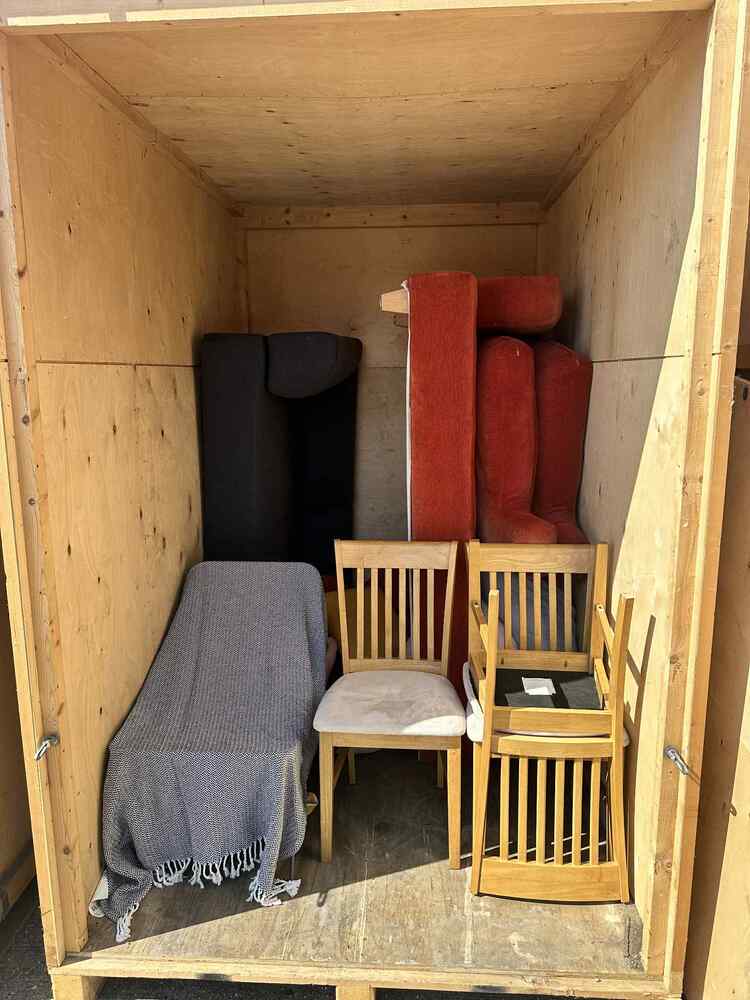 Removals company selling out abandoned storage units content. Furniture and household items visible from the photo.