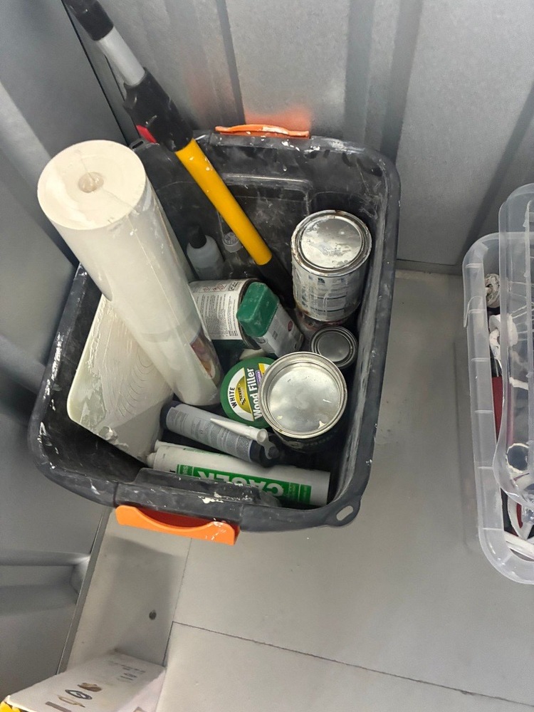 This unit is 10sqft, few items left abandoned by customer, consisting of many decorating items used to decorate. item that appears to be a wallpaper stripper