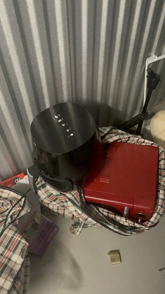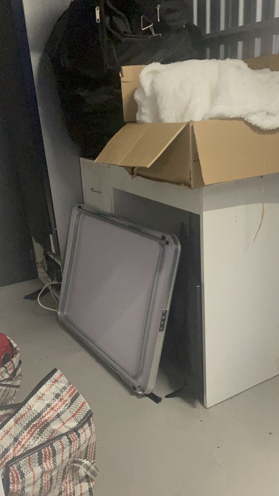 This 50 square-foot unit had one tall fridge, a working desk, flat pack table, electric strimmer, printer, microwave, deep fryer, divan bed, but no double mattress