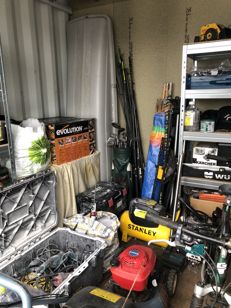 Contents of 10x8x8 ft Storage Container including a variety of goods including mountain bikes/fishing rods/camping equipment/golf clubs/various hand & power tools formerly from granite worktop contractor/lawn mower and general household goods ideal for car boot or ebay seller.
