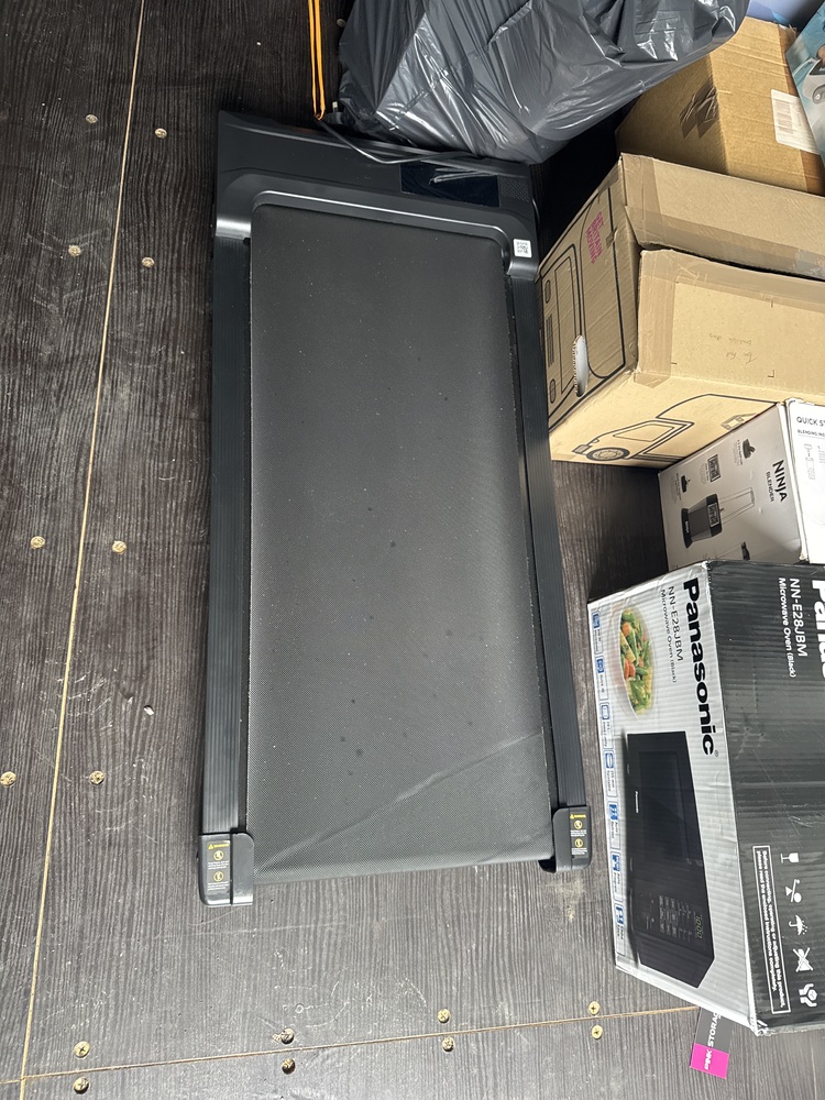 Auctioning the contents of a storage container featuring a range of valuable household items. Includes a quality treadmill ideal for home fitness, a large stylish mirror perfect for interior décor, and a large television offering great entertainment potential. Also included are multiple bags of assorted household items, providing a variety of useful everyday pieces and hidden gems.