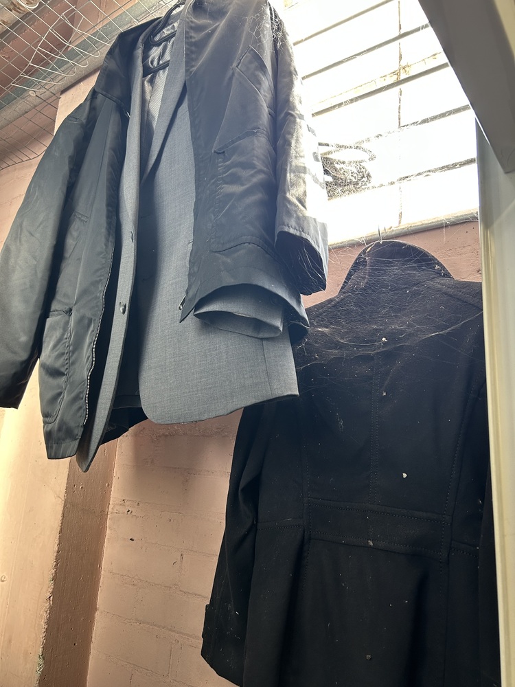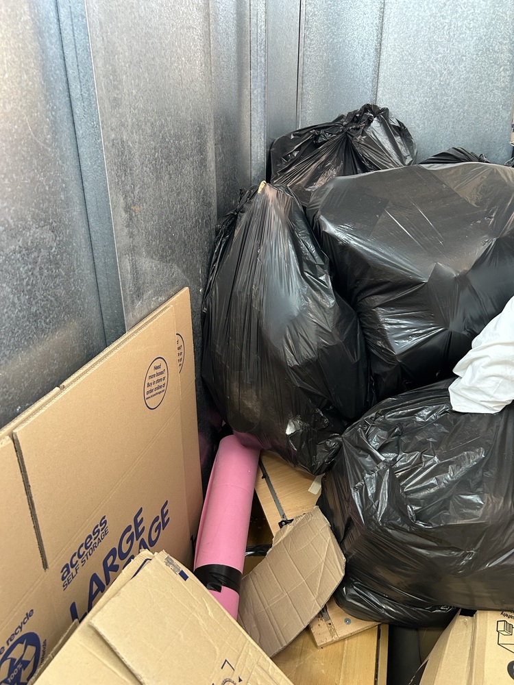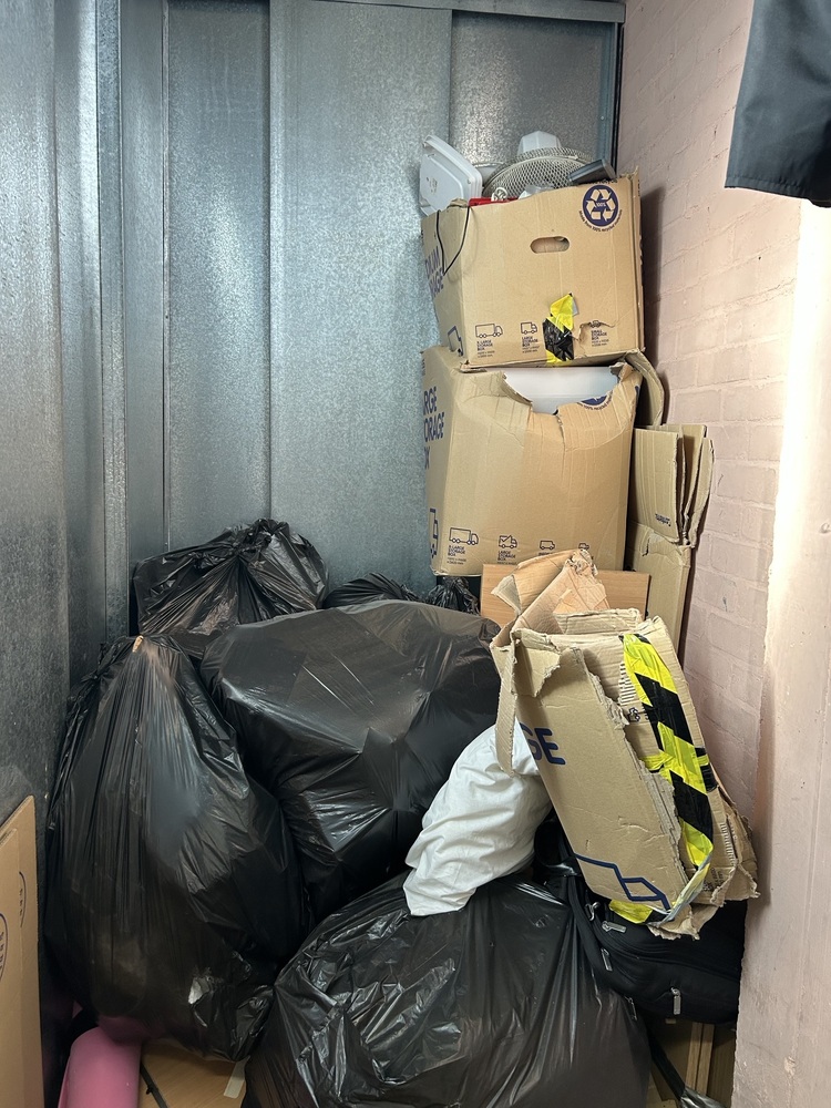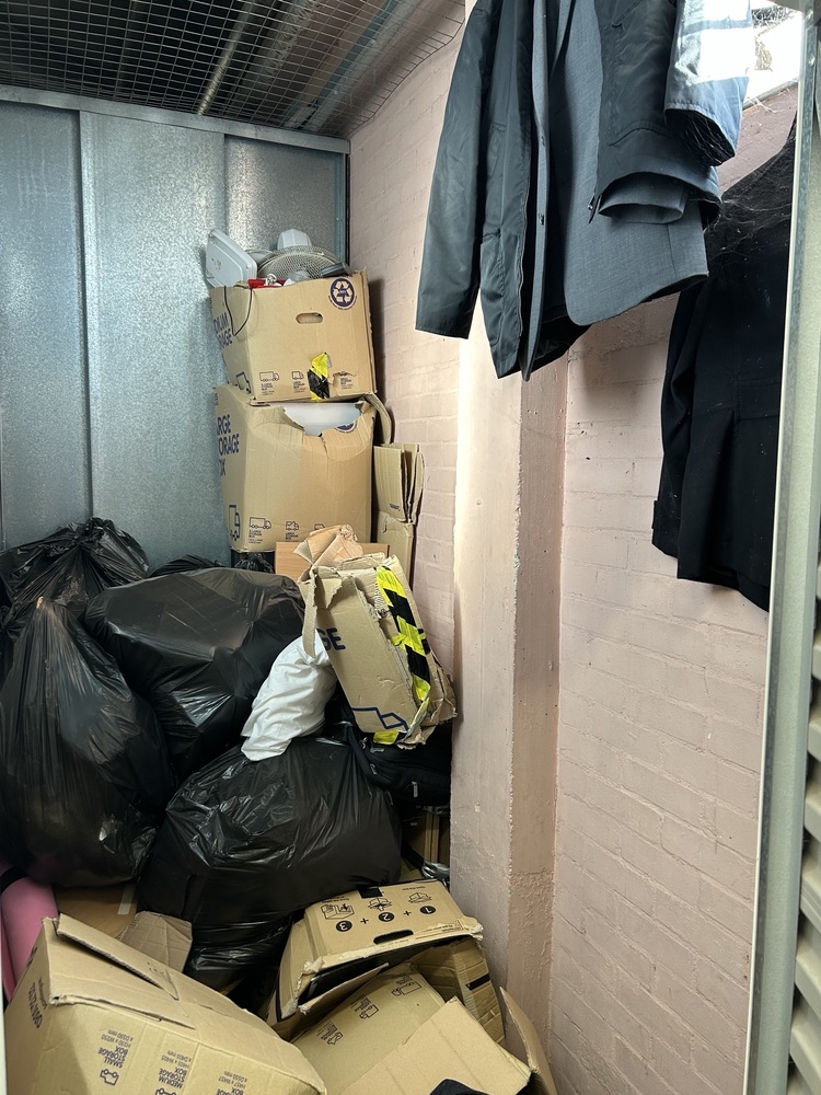 Contents of unit: Fan , Boxes of personal items , suit, jacket, bags of personal goods other clothes