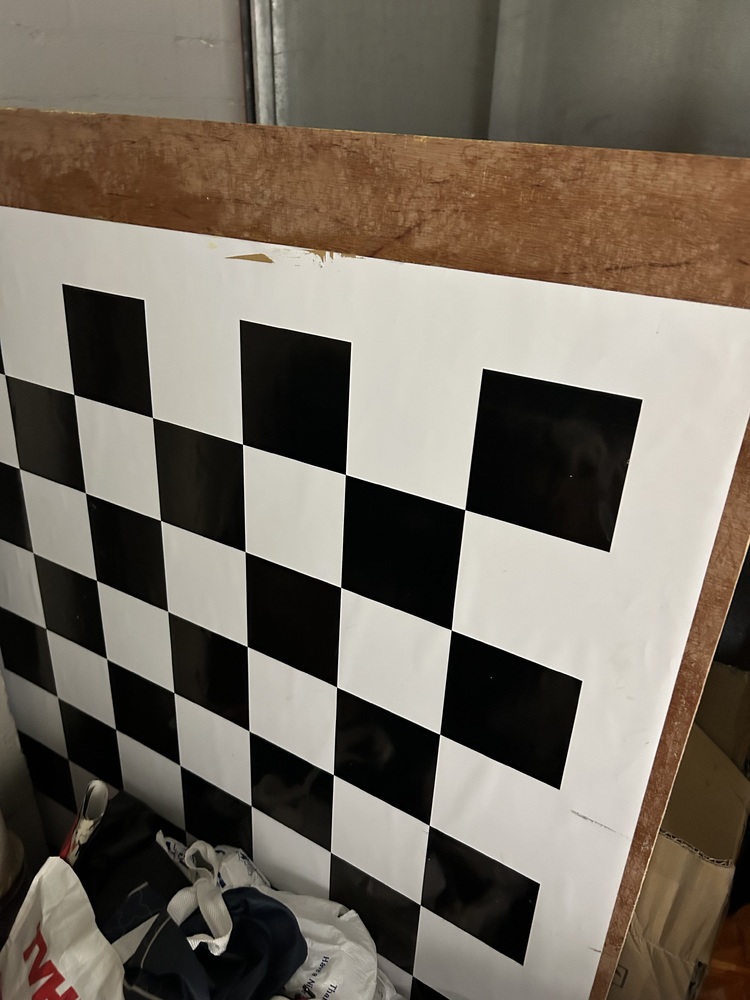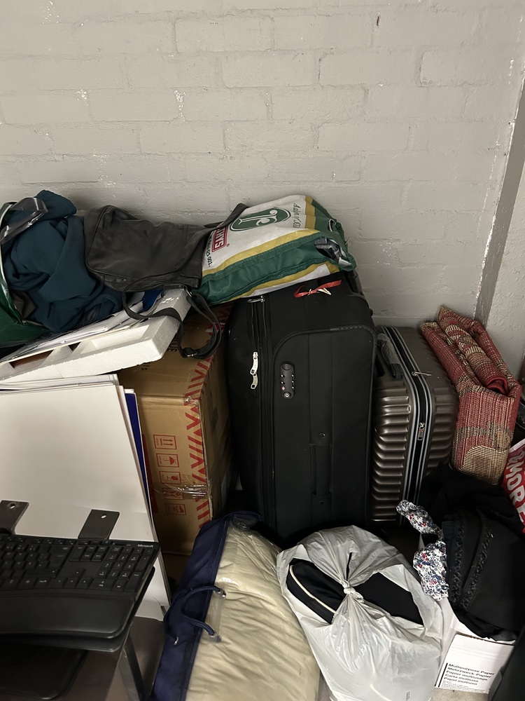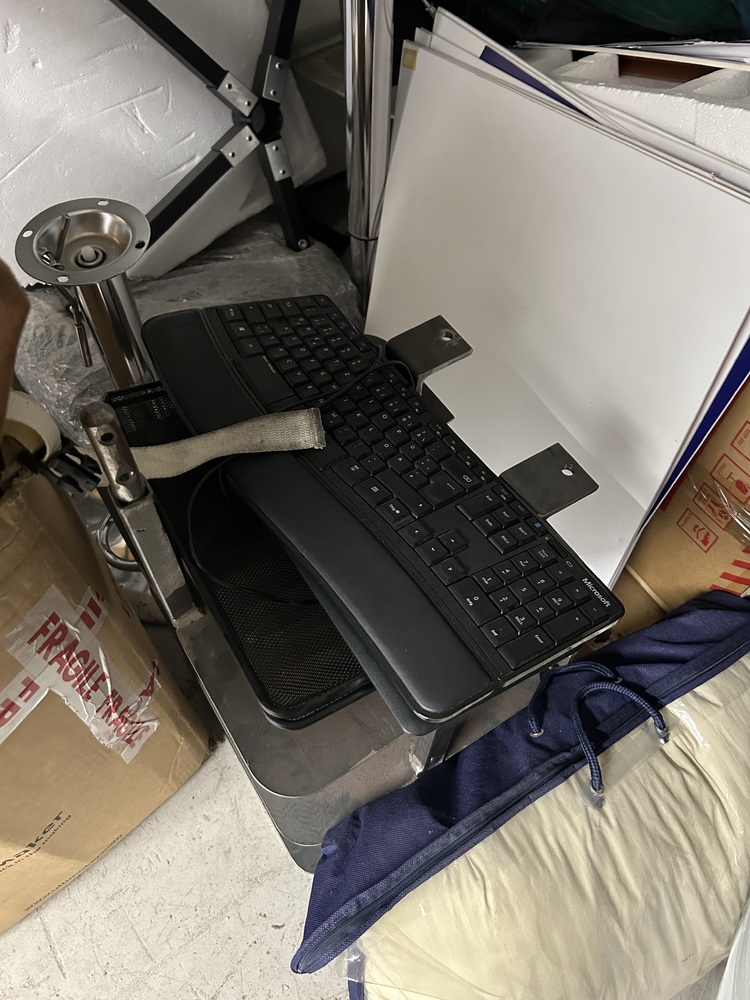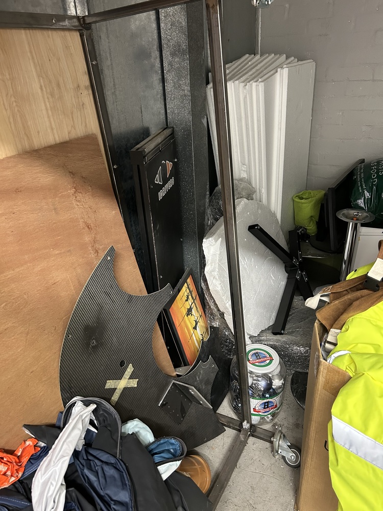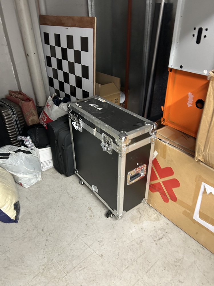 2 suitcases, Boxes, filing cabinet, decorations, LED panel, large marked checkboard, monitor, keyboard, metal boxes