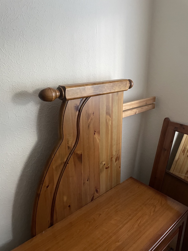 Large pine framed mirror, bed headboard, and glass-fronted cabinet