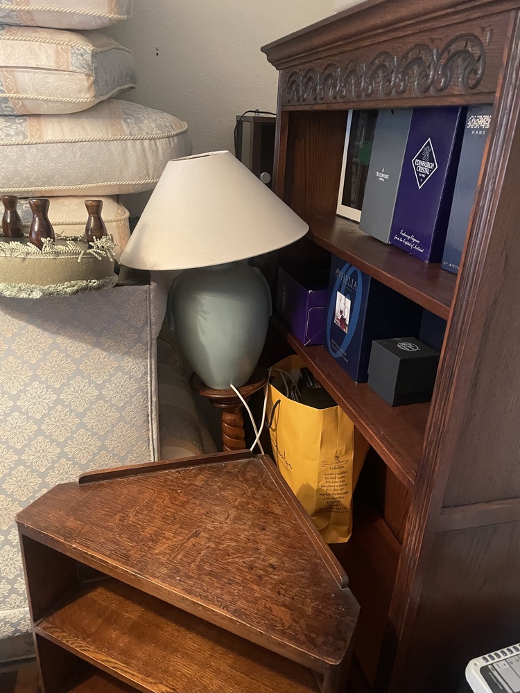 Dark oak and mahogany-style furniture, including a corner cabinet, console table, bookcase, and nested side tables
