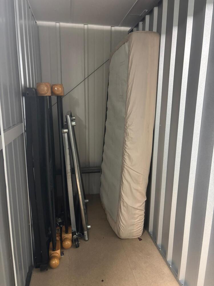 25 sq. ft storage unit sold as pictured, containing mattress and bed frame.