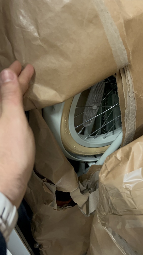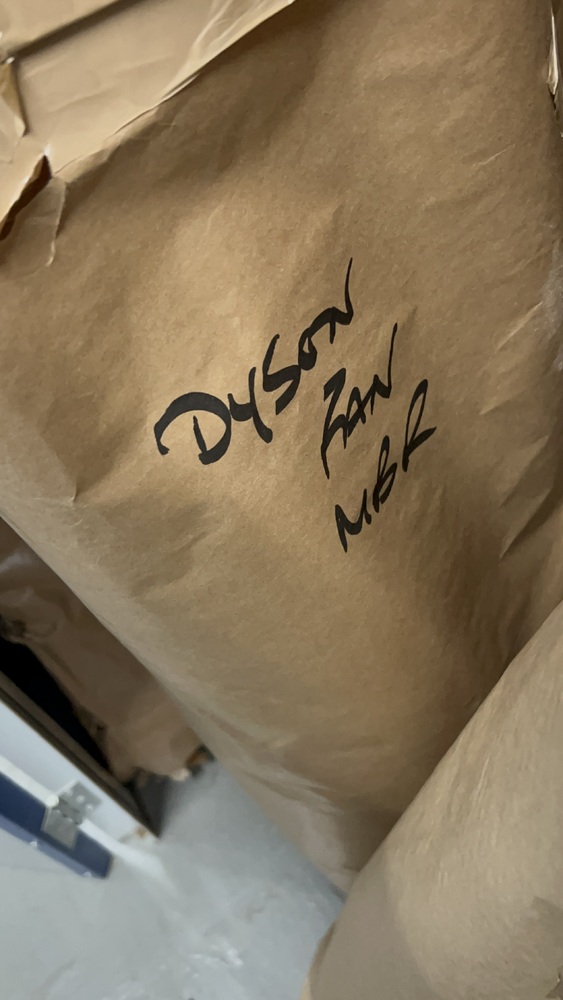 Professionally wrapped home items, likely by a removal company. Dyson fans as per photos, childrens bike, boxes and what look like furniture wrapped.