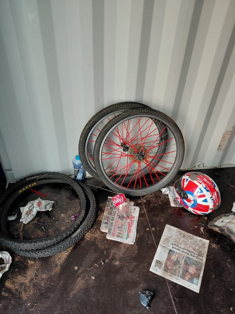 Quad bike (unknown if it is in working condition), helmet and wheels.
