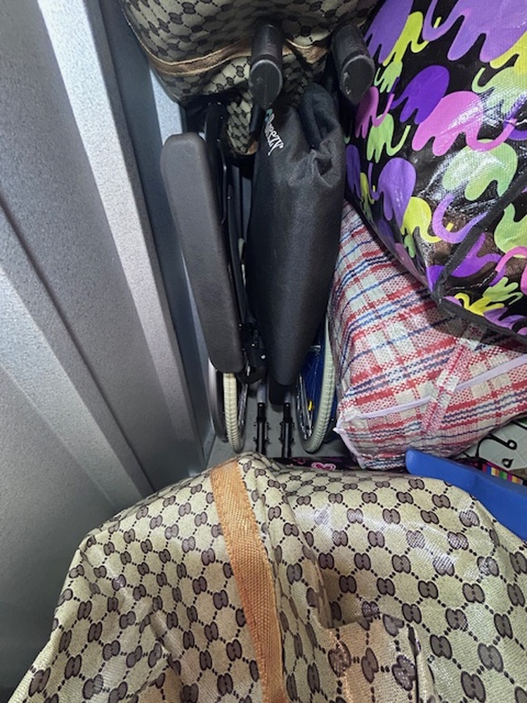 Boxes and bags of personal and household effects, folding wheelchair, kitchen items, fan heater, lamps, 8 large bags