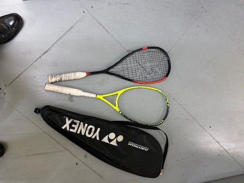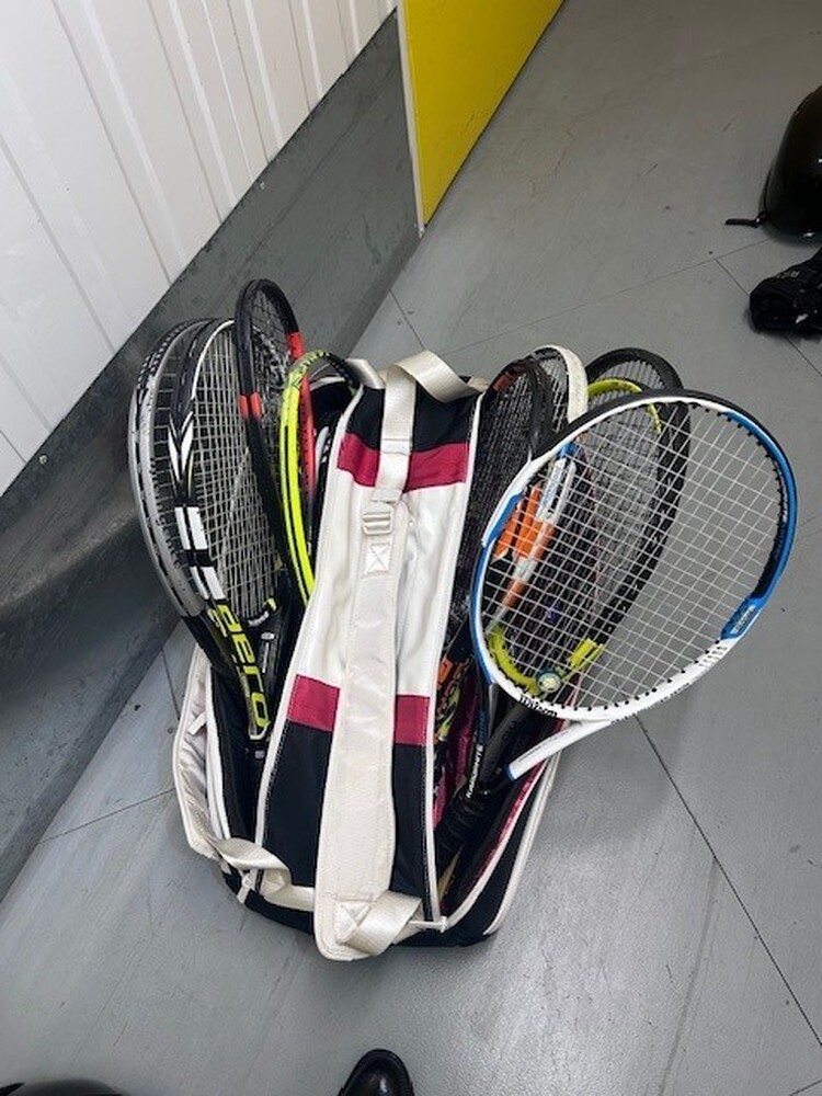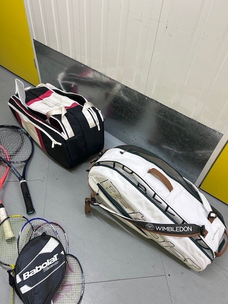 4 x badminton racquets, 14 x tennis racquets, 2 tennis bags, Bag of golf balls, tees etc, Boxes and bags of personal and household items.