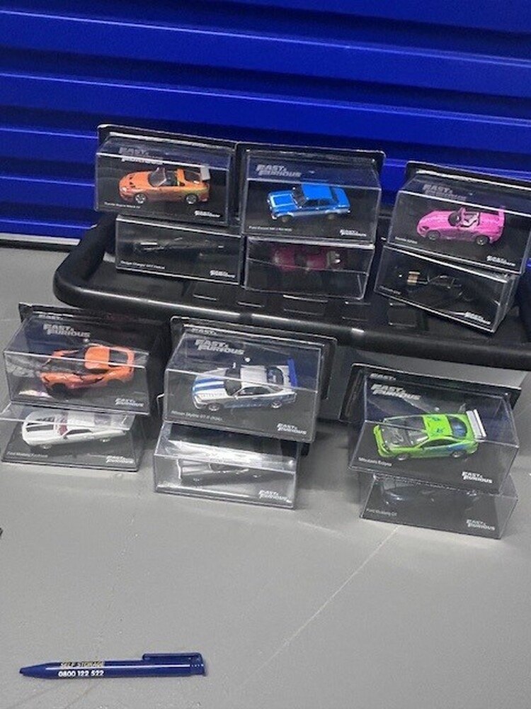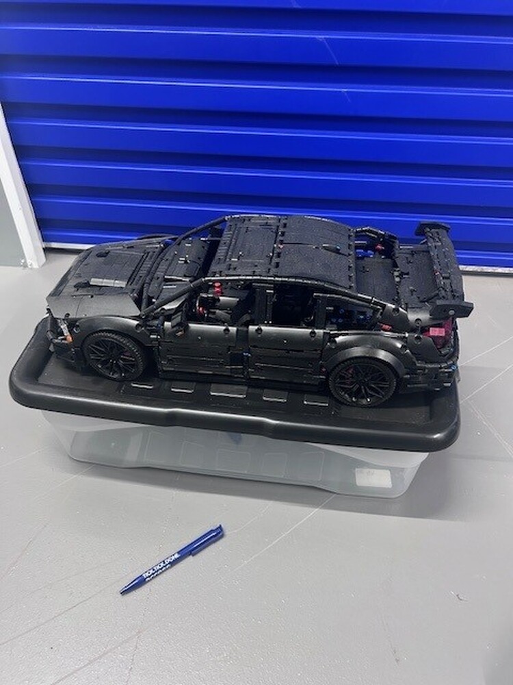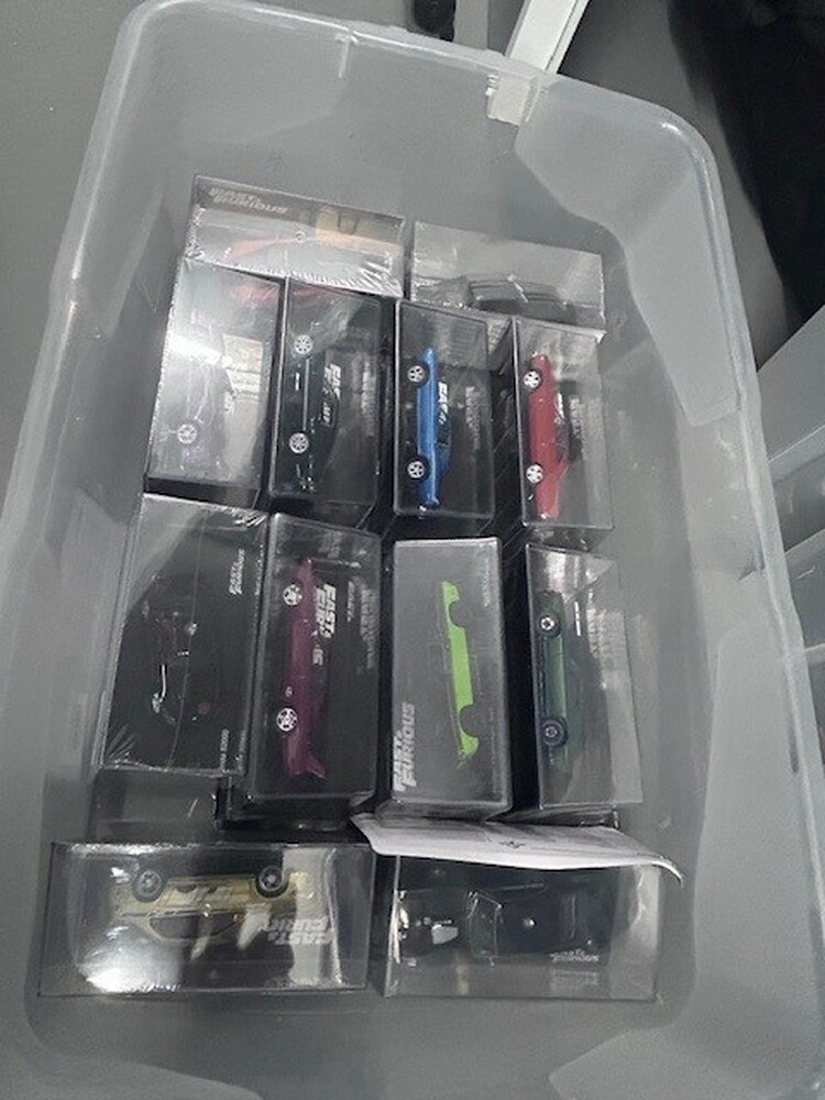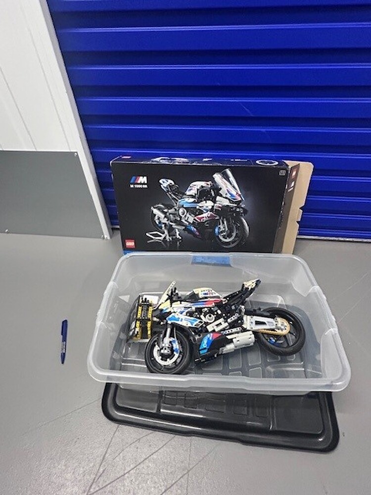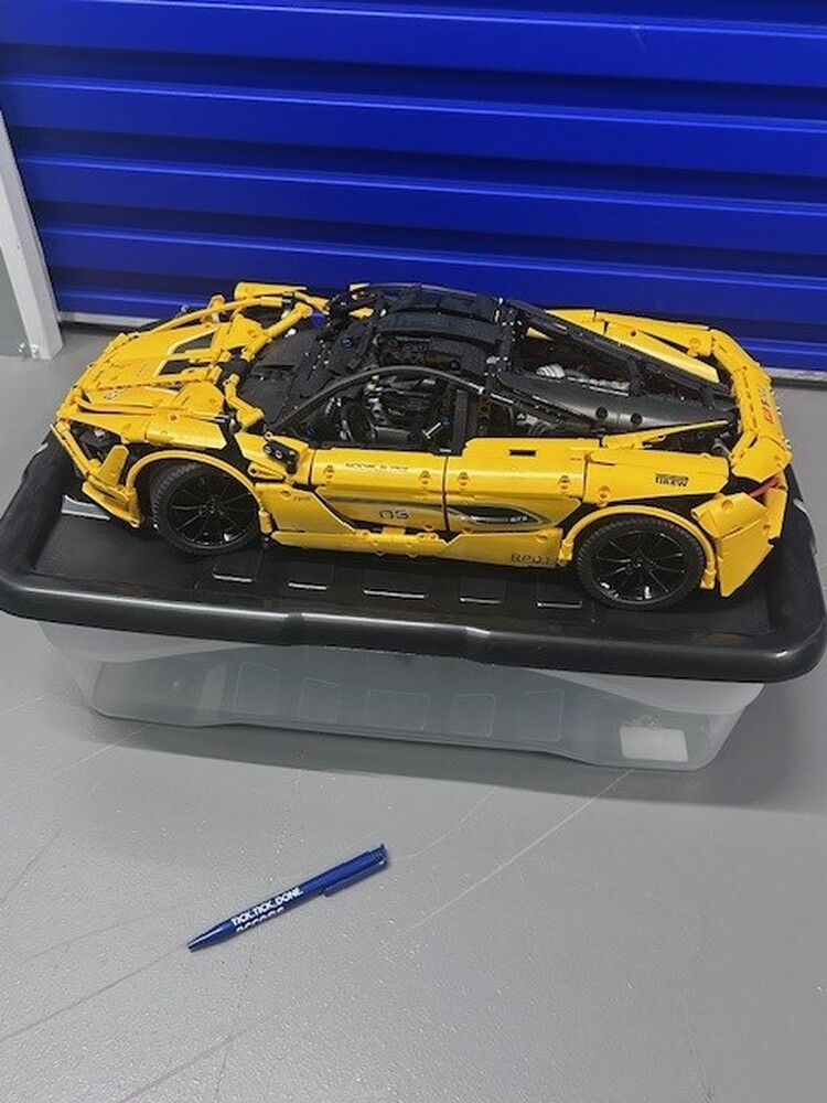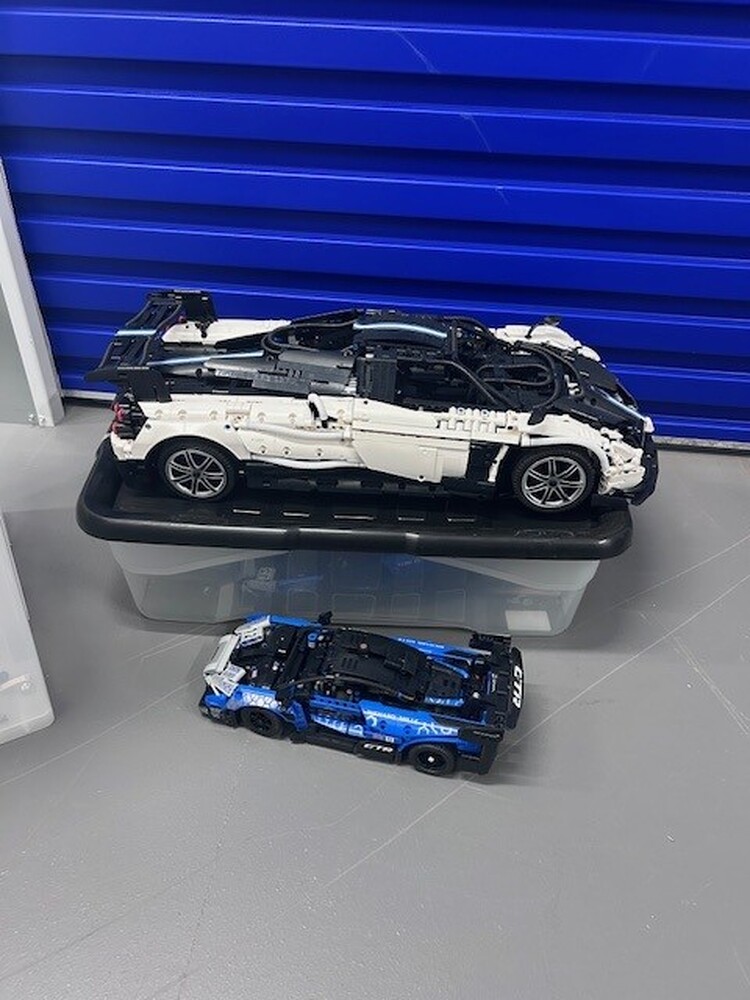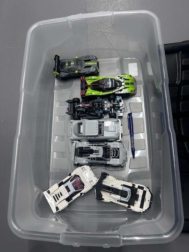 7 plastic storage boxes with Lego Tecnics models: BMW M 1000 RR, Mclaren 720s, Jeep, Ford Pick Up truck, Porche GT, and others. Small Lego GTR. 39 x Fast and Furious model car magazines, Huddersfield Town FC Shirts with badges. 5 sports bags. Nokia phone. My Passport Wireless. Skross travel adaptor. MyCoach training watch. Adidas sports trackers.