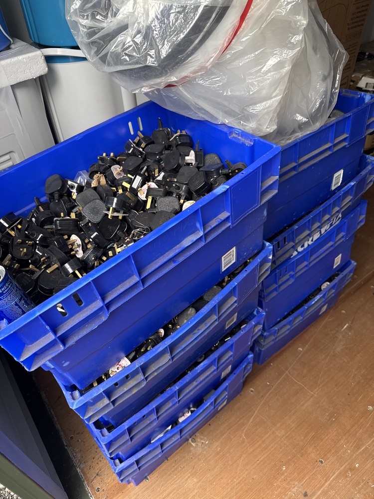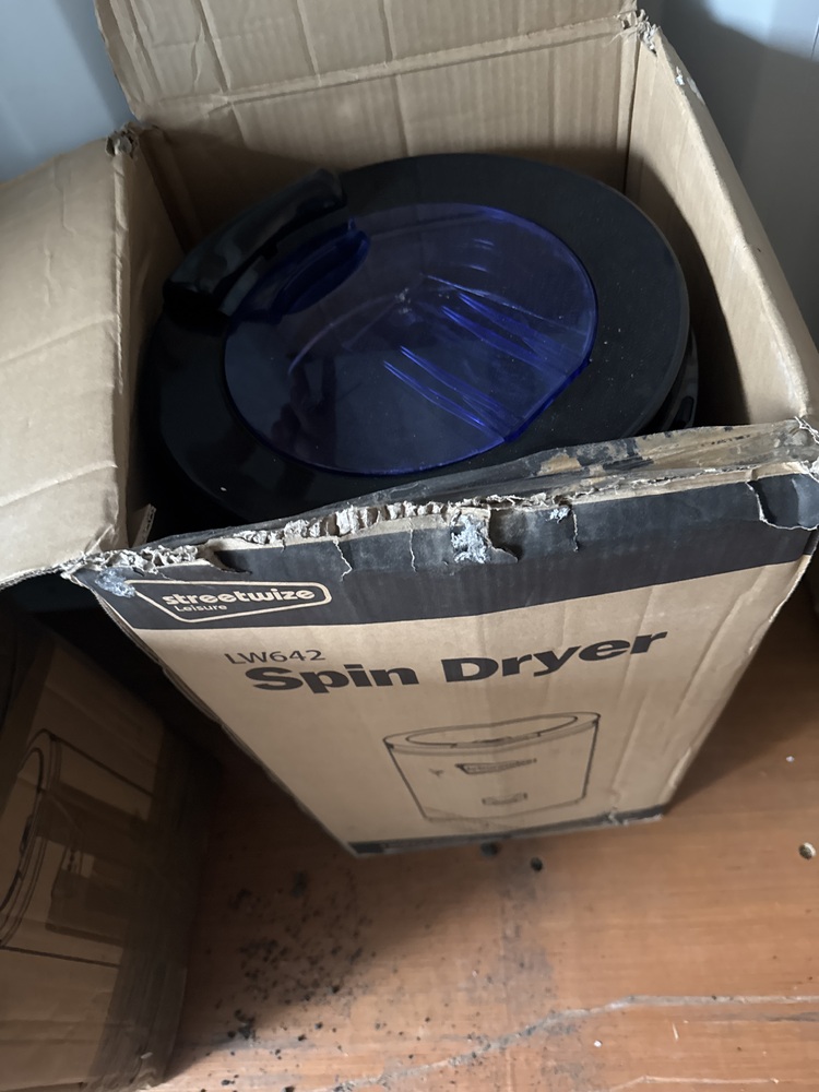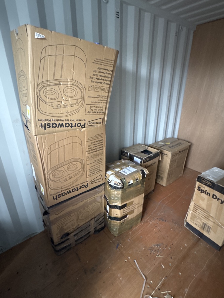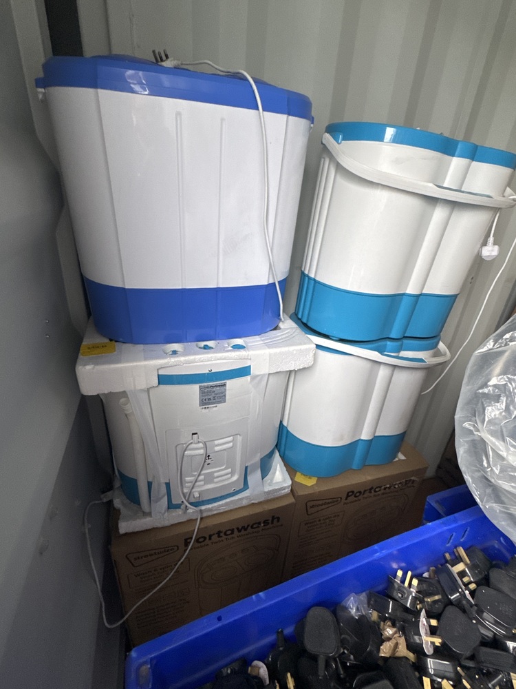 Auctioning the contents of a storage container containing a range of practical household and electrical items. Highlights include several 3-point plug ends, ideal for electrical repairs or extensions, as well as compact portable washing machines and dryers — perfect for small homes, caravans, or temporary setups. These items offer great value for anyone seeking functional appliances and spare electrical components.