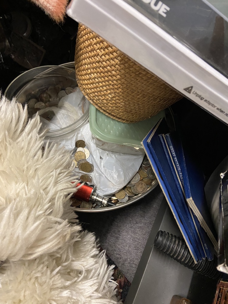 Paintings, chair, treadmill, ornaments, table, chairs, bedding, suitcases, rugs, blankets, teddy bear, clothes, coats, books, and bucket full of assorted old coins.