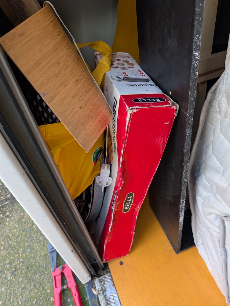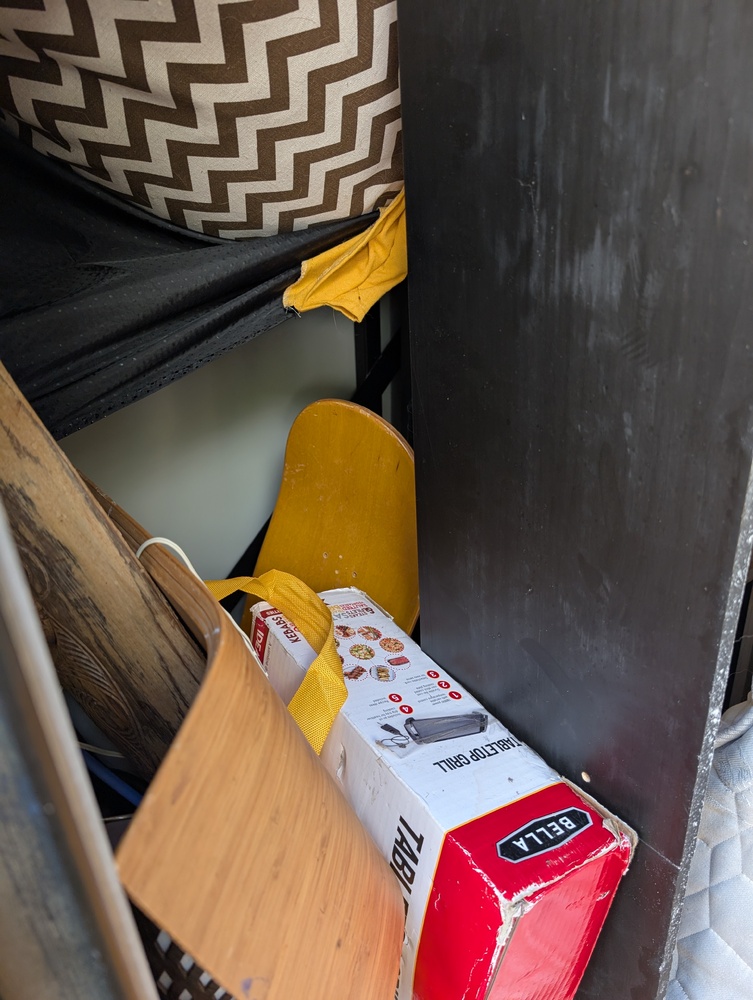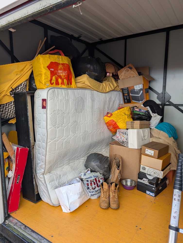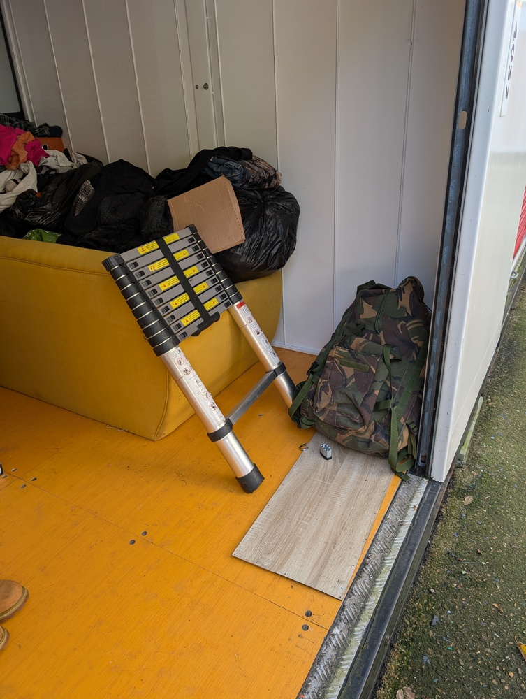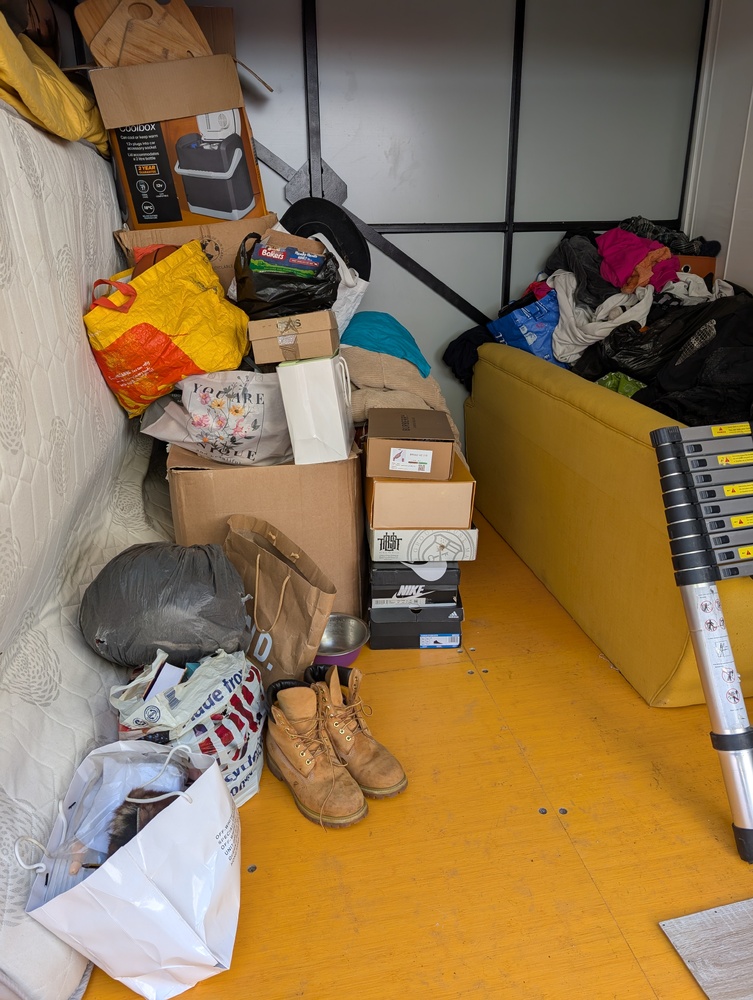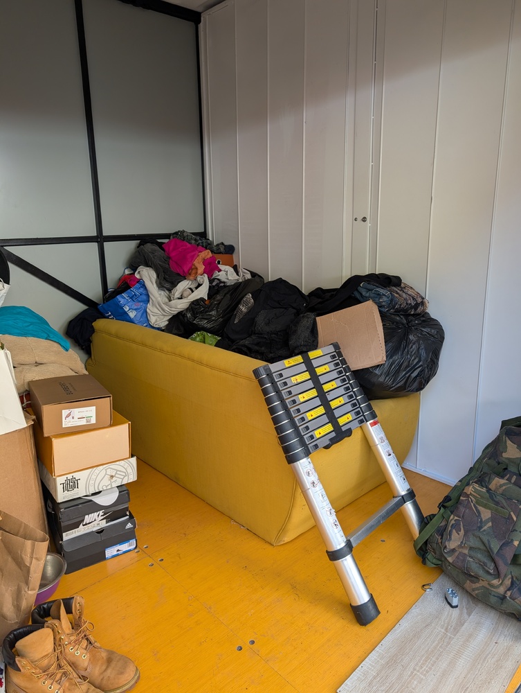 Contains personal items, as well as mattress, shoe boxes, assorted other boxes, a telescopic ladder, sofa, camo backpack, other odds & ends