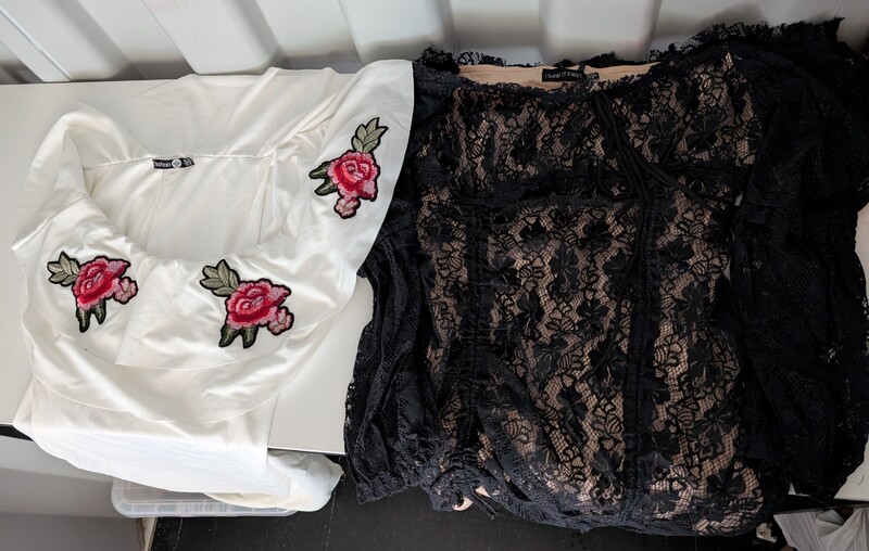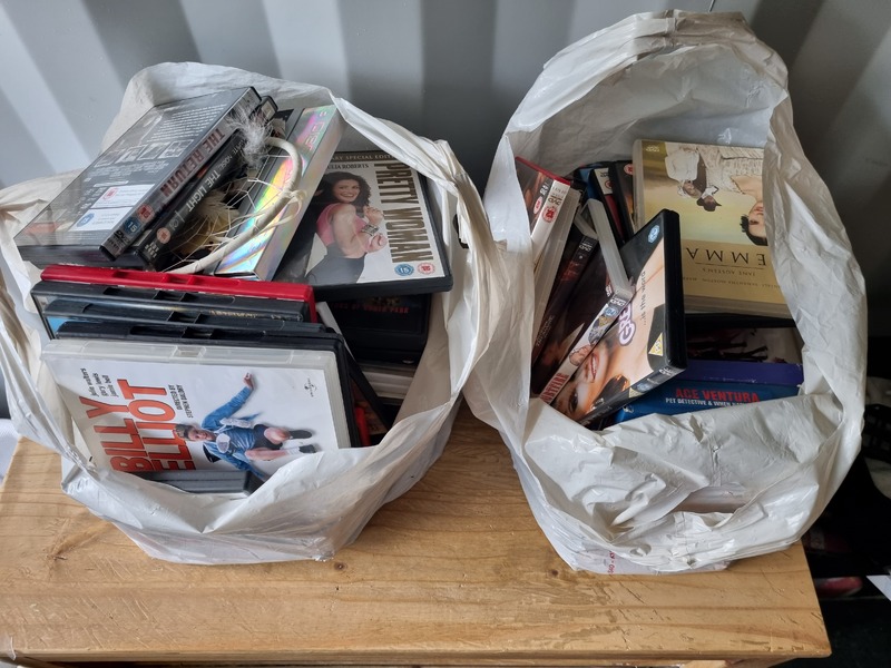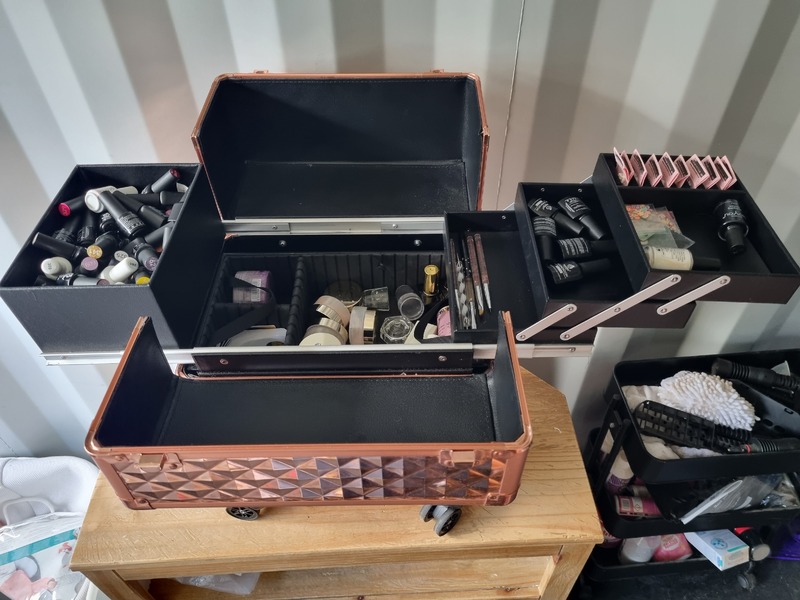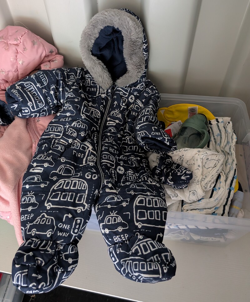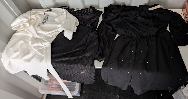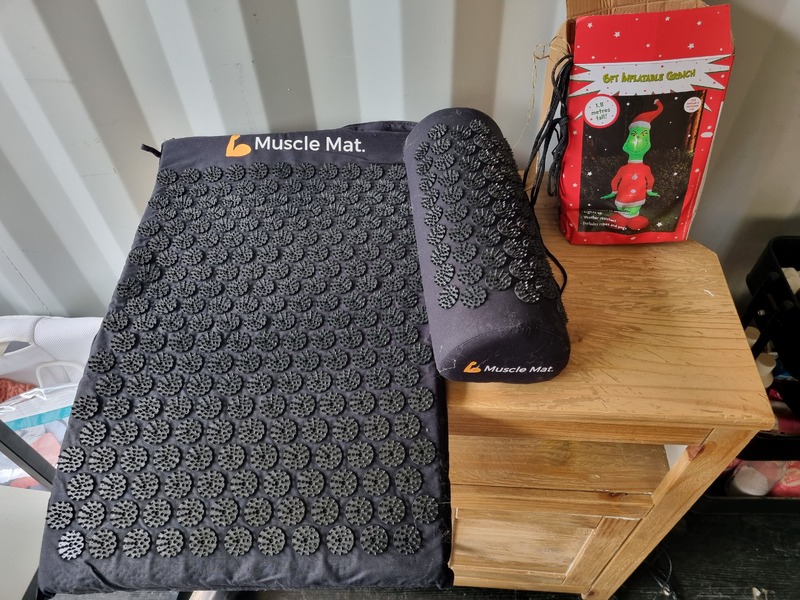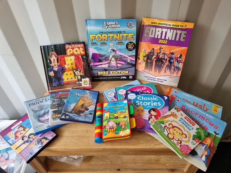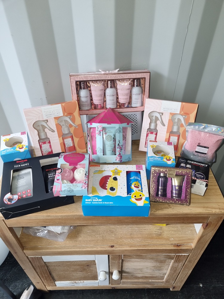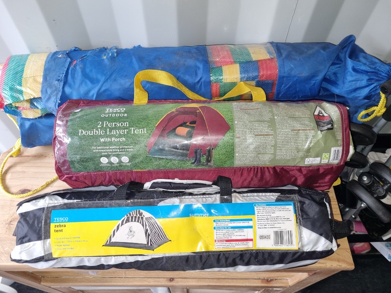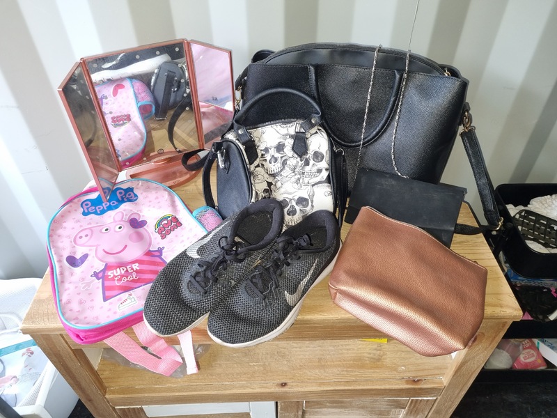 Chest of drawers, Sofa and matching footstool, White unit, Table and 4 chairs, White corner desk, Children's car seats, Screens, Pushchair, Footstool, Various nail and beauty items, DVDS, Assorted tents, Muscle mat, Assorted women's clothing, baking items, Children's clothing, Inflatable grinch, roller blind, cooker, freezer, gift sets, Xbox games and controller, assorted baby items, Children's books, assorted jewelry