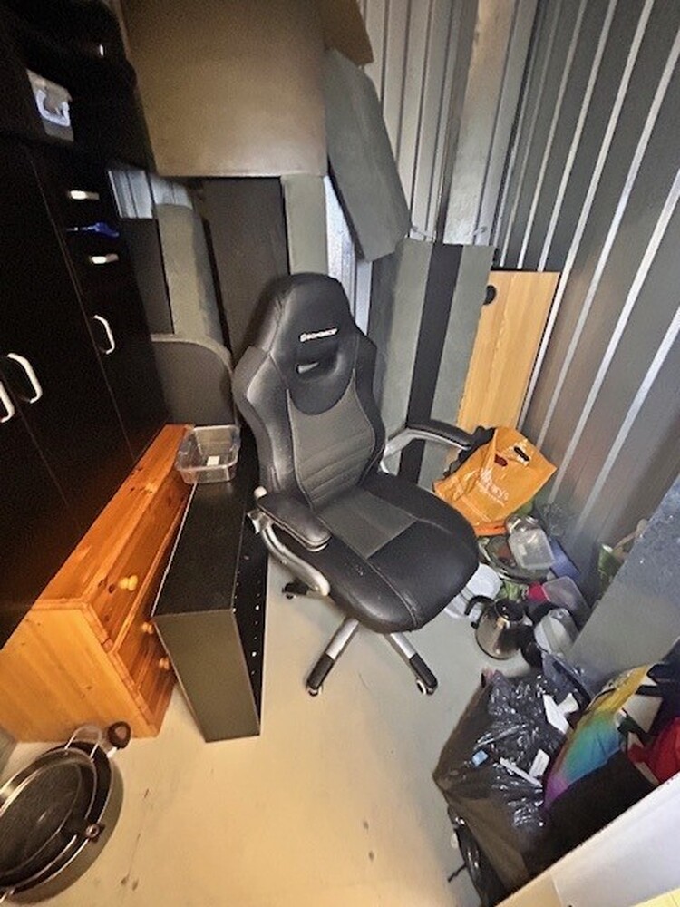 Gaming Chair, Pine Chest Drawers, 2 x Black Wooden Cabinets, Desk, Ironing Board, Grey Sofa, Xmas Decorations, Bags of kitchen utensils, various saucepans . xxxxxxxxxxxxxxxxxxxxxxxxxxxxxxxxxxxxxxxxxxxxxxx