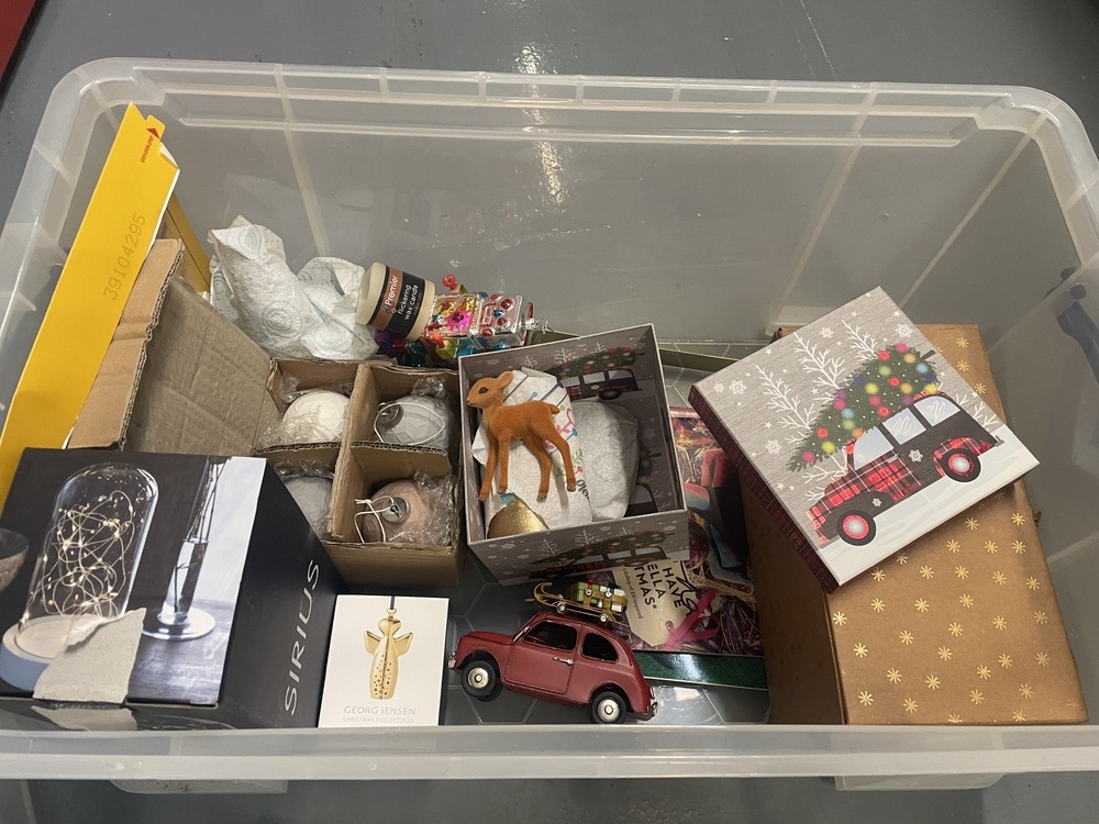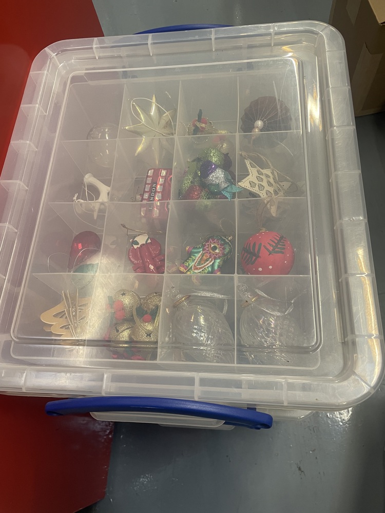 Plastic storage box containing boxed decorations