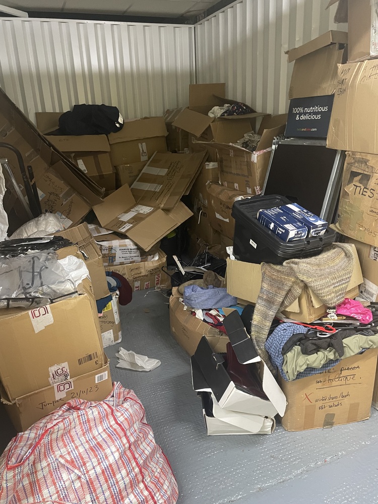 This is a 75ft room consisting of approximately 40 boxes of clothing ,shoes,berets and miscellaneous items