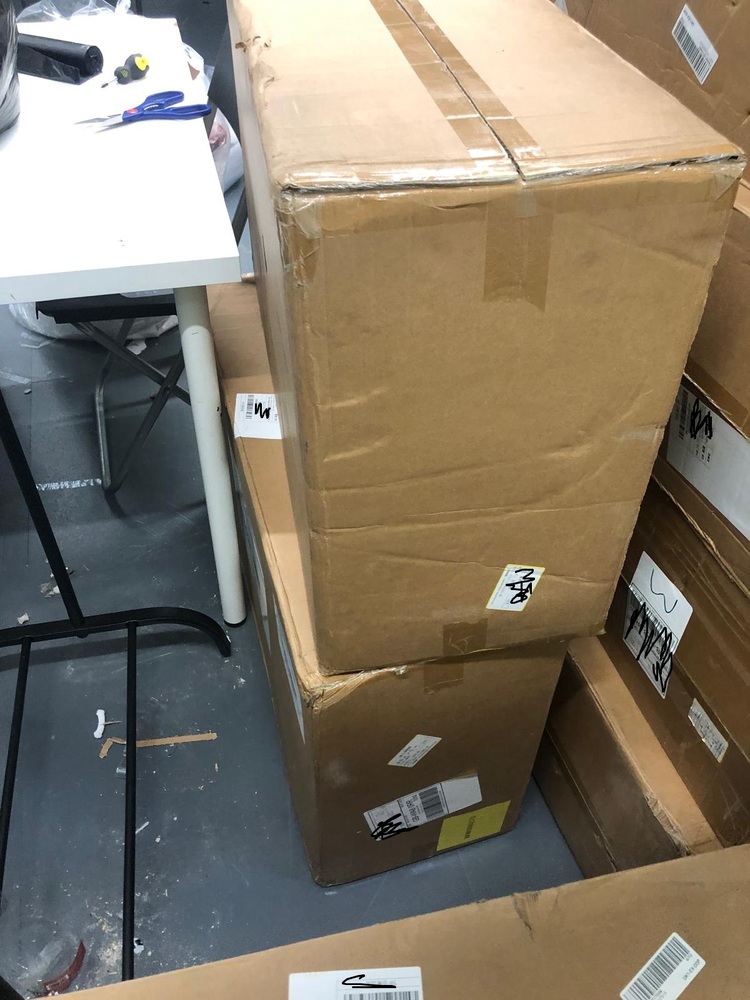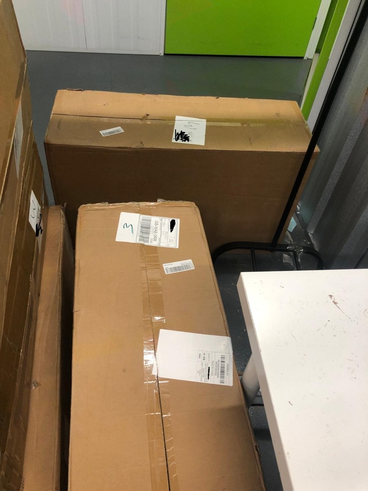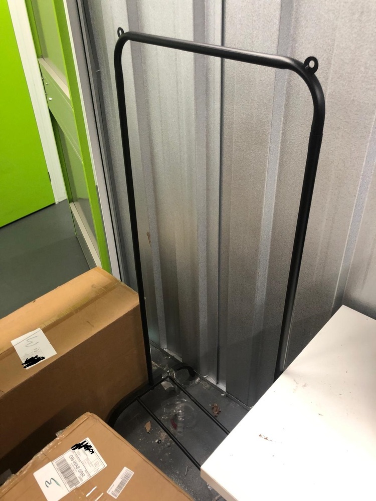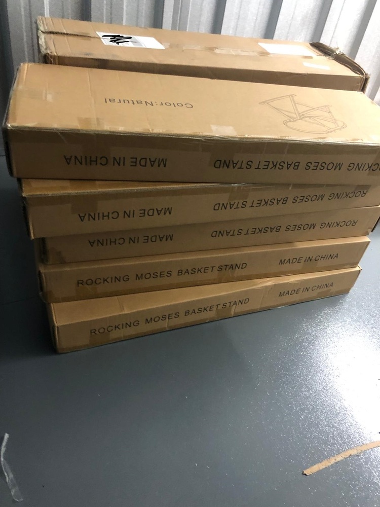 50 brand new unopened rocking moses basket stands flat packed in boxes. 1 clothes rail, folding chair, plastic drawers, small desk and 2 crib mattresses.