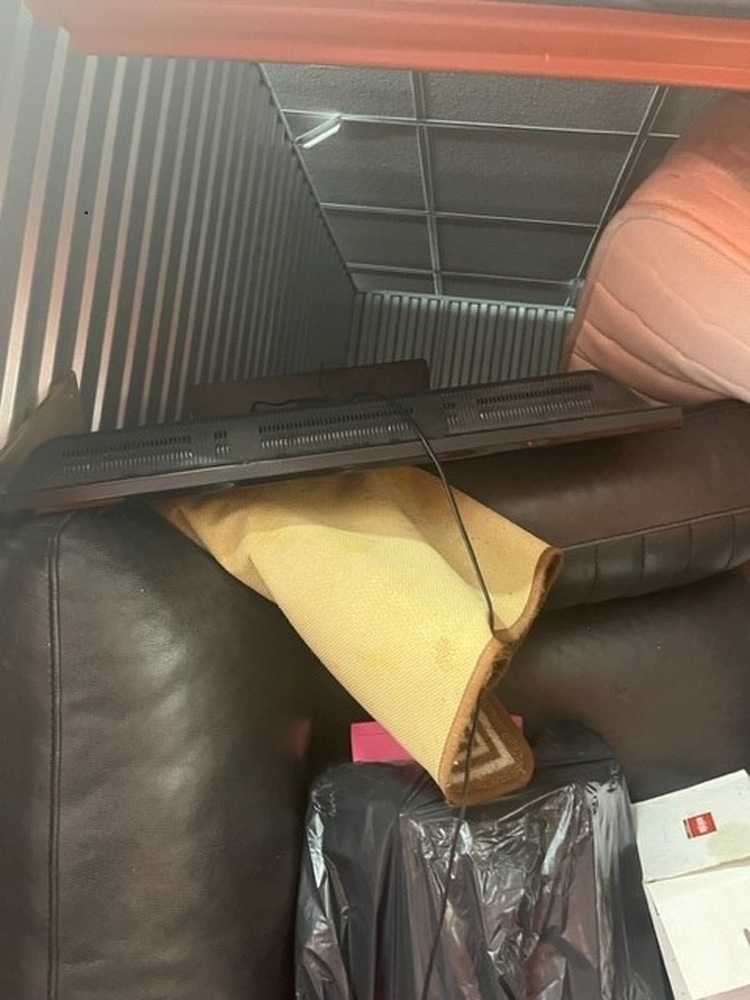 3 seater sofa, microwave, office chair, various pictures, Television, rug, mattress, unchecked boxes.