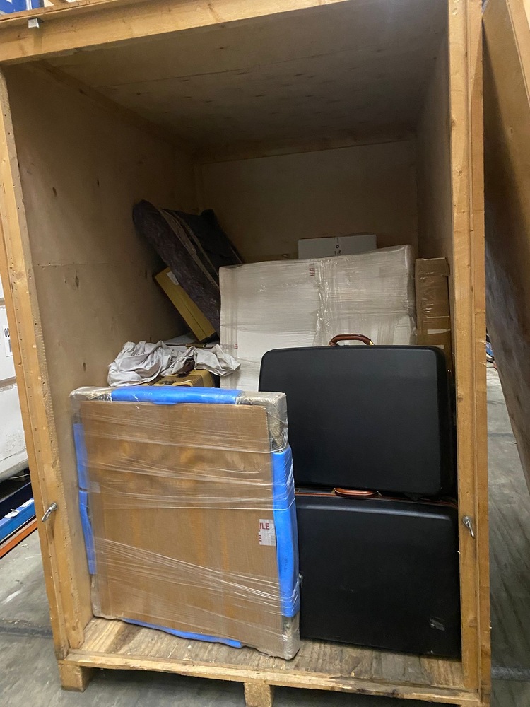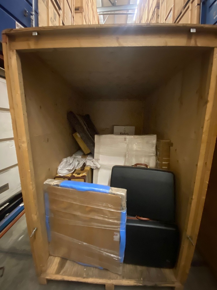 Storage unit with multiple goods. There are 2 suitcases. Other items include various boxes and paintings.