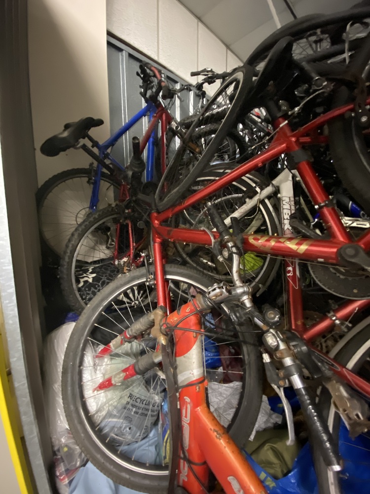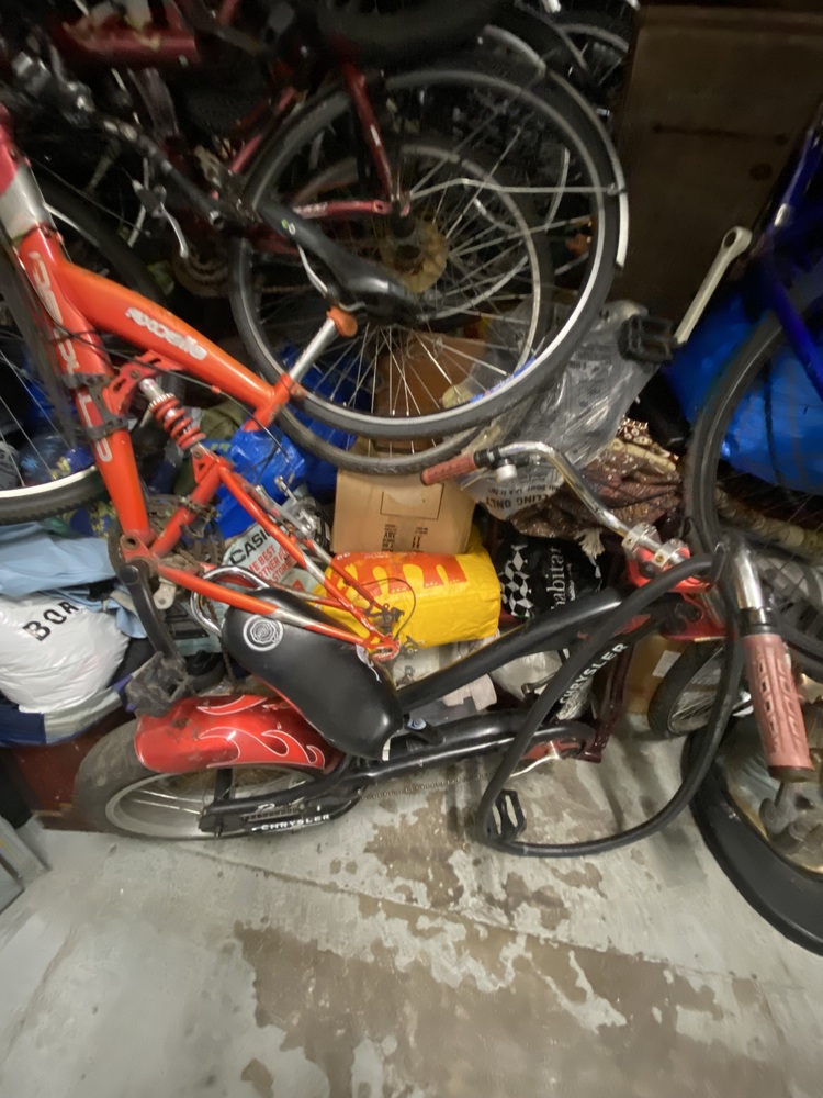 Around 15-20 bicycles, 2-3 carpets, wall hanging, clothes, household items, stool, bags and personal items and household decor